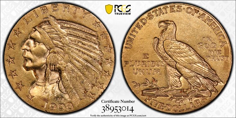 View all auction prices realized for 1908-D $5 coins