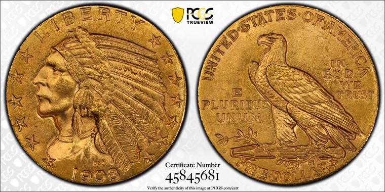 View all auction prices realized for 1908-D $5 coins