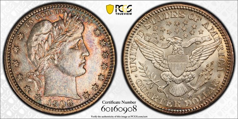 View all auction prices realized for 1908-D 25C coins