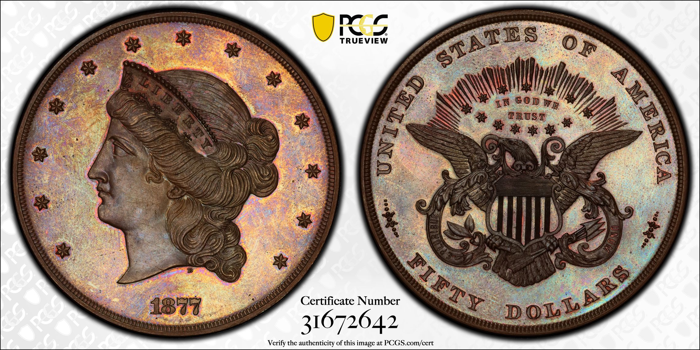 Despite their large size and beautiful Coronet design, only seven examples of the 1877 $50 Half Union are known that were struck in copper, and just one coin is believed to be in private hands. Most other surviving examples are held in museums or institutions. The concept behind the 1877 $50 Half Union was first presented in the 1850s. Fast forward more than 20 years, and Director of the United States Mint Henry Richard Linderman ordered examples of the 1877 $50 Half Union patterns struck for himself. Today, these pieces serve as time capsules of a tumultuous time in American history and provide a glimpse of what the coin would have looked like if it was struck for circulation. A spectacular example of this coin, graded PCGS MS67BN, was sold by Heritage Auctions for $408,000 in 2024.