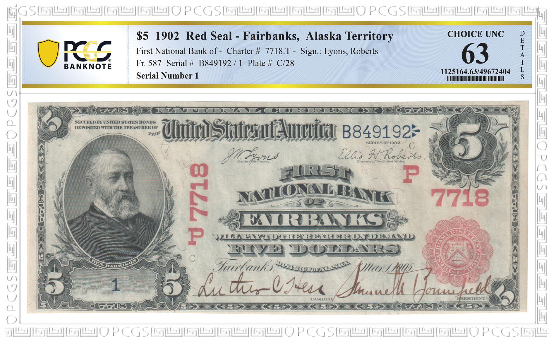 $5 Red Seal 1902 Alaska Territory, Fairbanks, First National Banknote Fr. 587 PCGS Banknote Choice Unc 63 Details