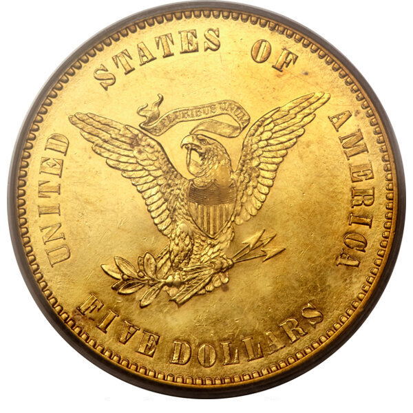 At first glance the piece is remarkable for its beauty. The obverse by James B. Longacre shows a finely executed Liberty head surrounded by 13 stars with the date below. The reverse, in a style associated with Anthony Paquet, depicts a spread eagle with a wreath and the motto “E. Pluribus Unum” above, the legend “United States of America” and “Five Dollars” encircling. Close inspection reveals a small but fascinating blunder: in the word “FIVE,” the “V” is actually an inverted “A.” Details such as this make Judd-271 especially distinctive among American patterns.