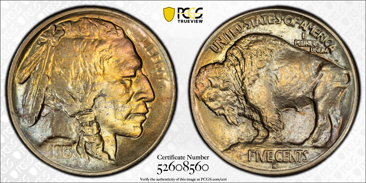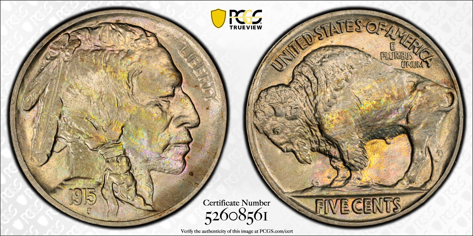 Violet centers merging to blue then gold much more pronounced than the Heritage image let’s on. Substantial die clashing on obverse, with additional clashing on reverse. A nice Truview candidate in the future.