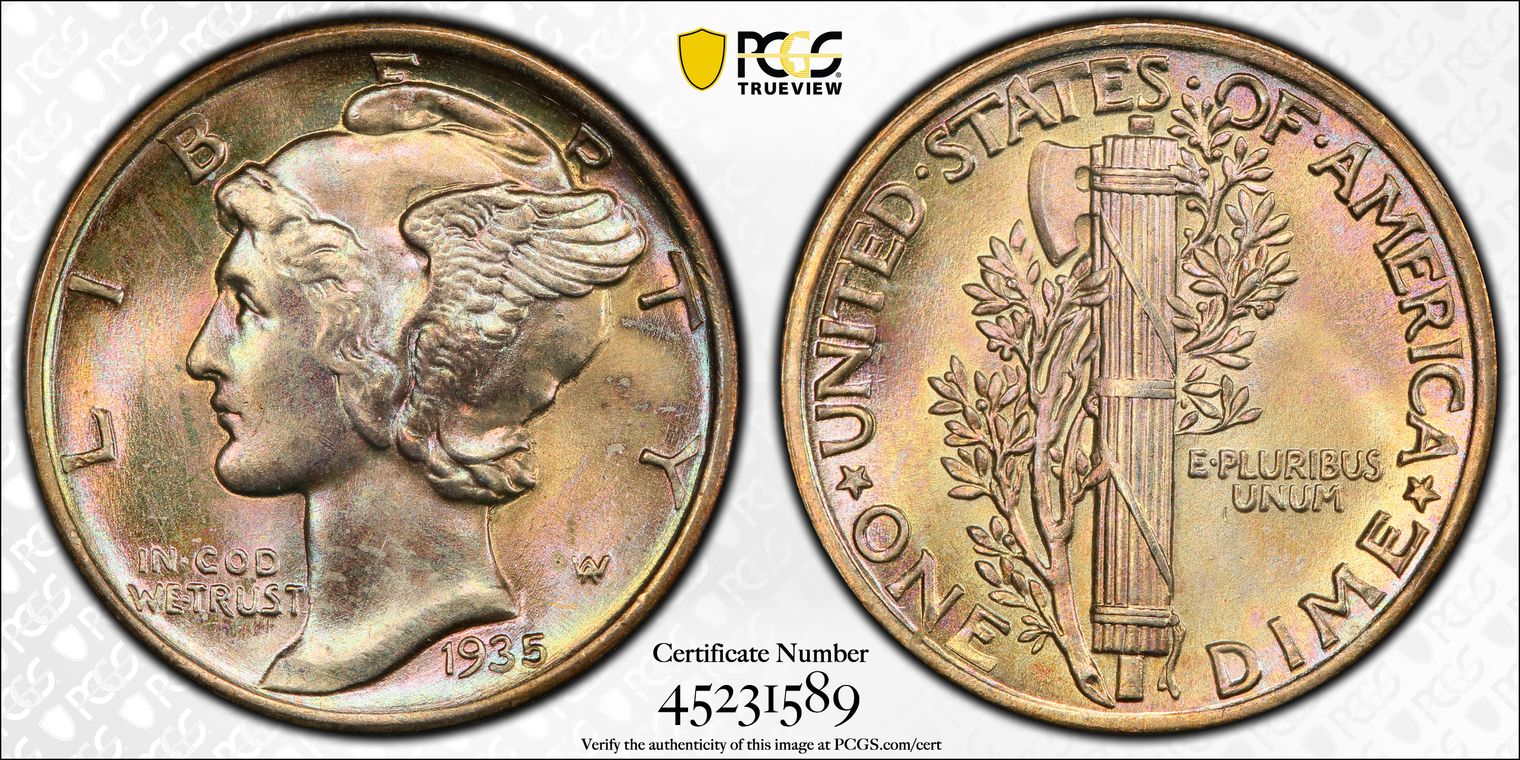 Struck from older dies, what this one lacks in strike more than makes up in overall eye appeal. Luster you expect for the 65+ grade. Super attractive color progression of gold on periphery to powder blue, to Amber in the centers.