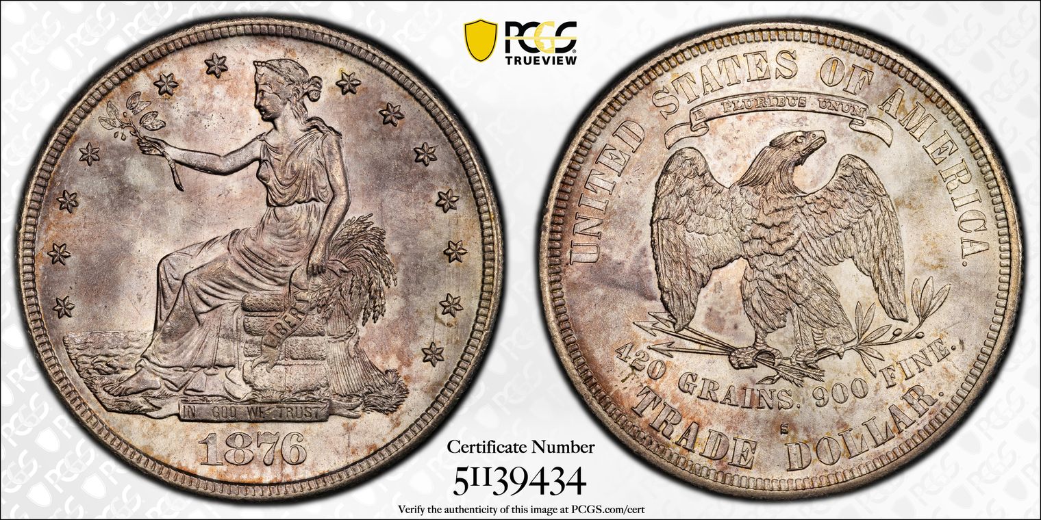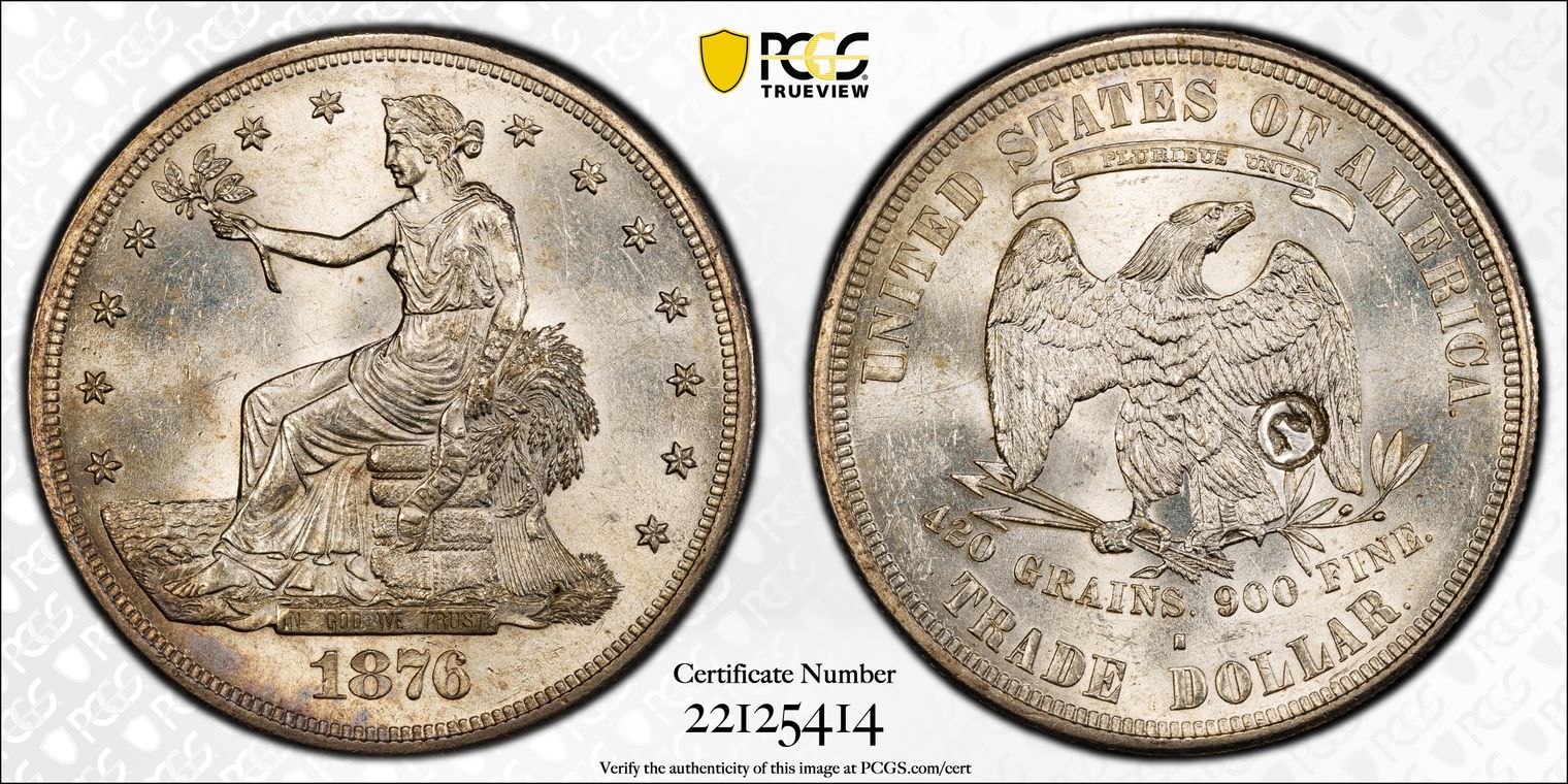 Obverse 1, Reverse 2. The vast majority of known 1875-CC trade dollars are Type 1/1. Nicely lustrous and has an overall sharp strike.