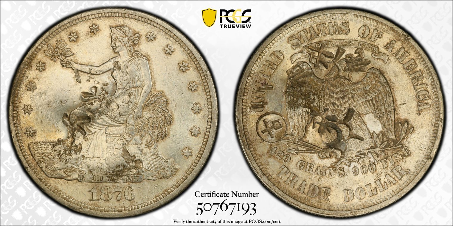 CAC - The only CAC-approved example as of 12/21. "...featuring a small chop mark on the reverse from TRADE to GRAINS.......Choice AU representative has only light wear, and the cream-gray surfaces are only moderately abraded save for that noted chop mark."