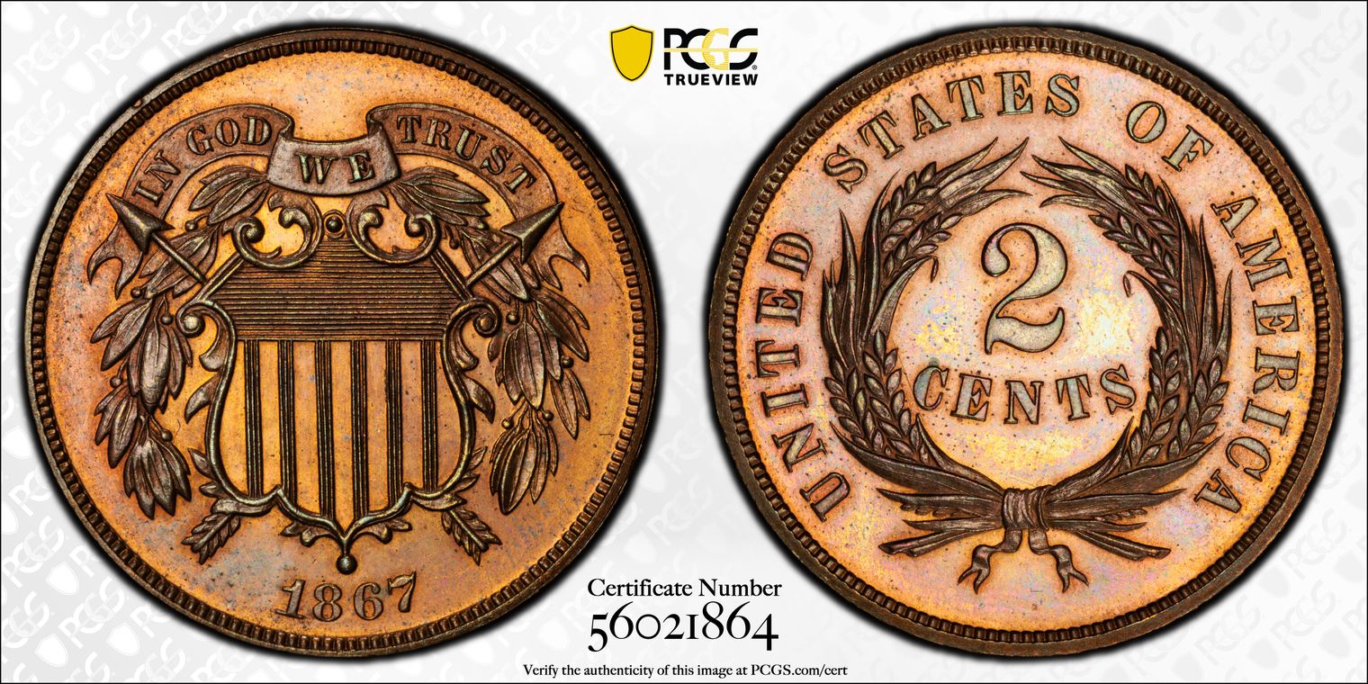 CAC - High R.7 - Struck in a surprising variety of compositions: copper / bronze, copper-nickel, oroide, and aluminum. The obverse displays a portrait of Washington facing right, GOD AND OUR COUNTRY around, date and two stars below. The reverse expresses the denomination 2 CENTS within a wheat wreath, UNITED STATES OF AMERICA around. CENTS is curved dramatically. The fields are deeply mirrored and show what some might call "autumn leaves" toning. Scattered dabs of rose, emerald, and yellow are scattered over each side. Deeply mirrored fields.