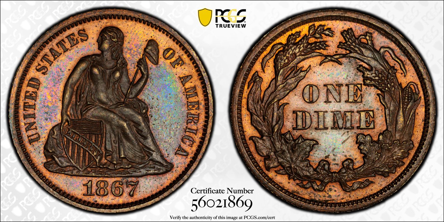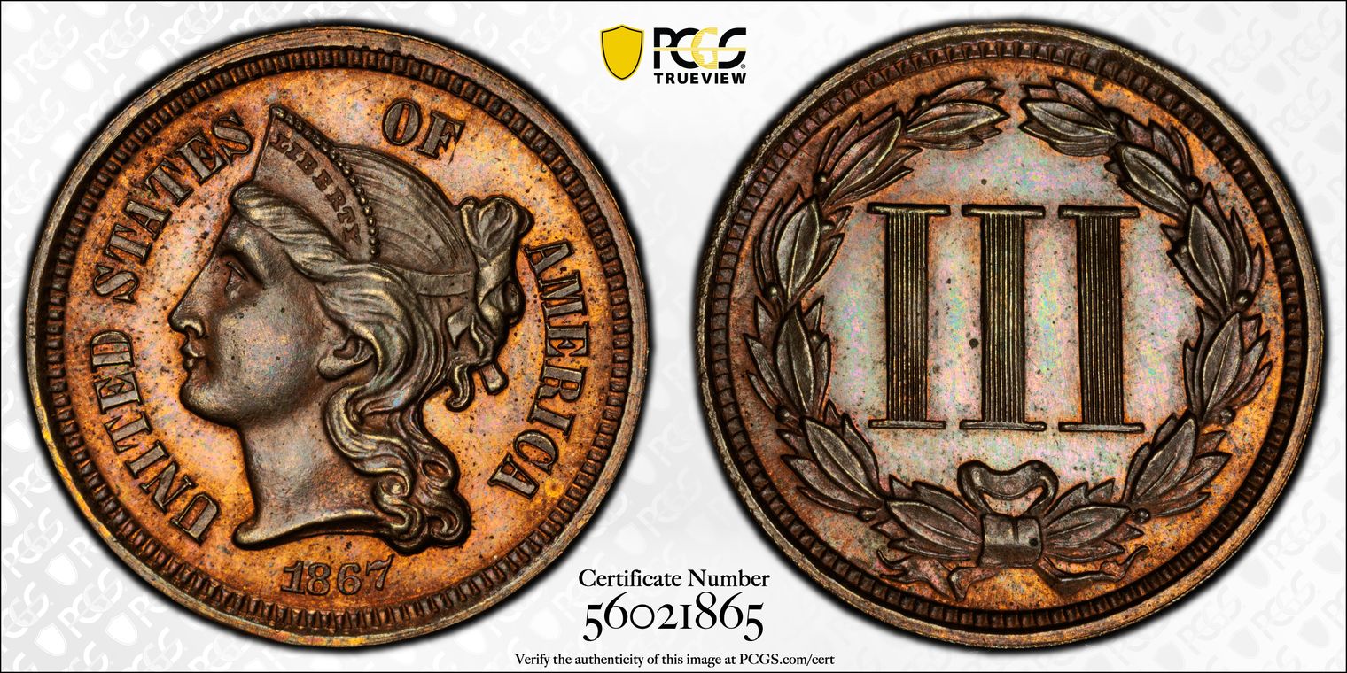 CAC - R.5 - Struck in copper with a plain edge. The highest graded at PCGS. This regular die trial piece shares the same obverse die as the scarce proof 1865 three cent nickel, since the date exhibits similar broad recutting. A high date variant, unlisted in Pollock, is also known. Richly patinated in ruby-red, peach-gold, and jade-green