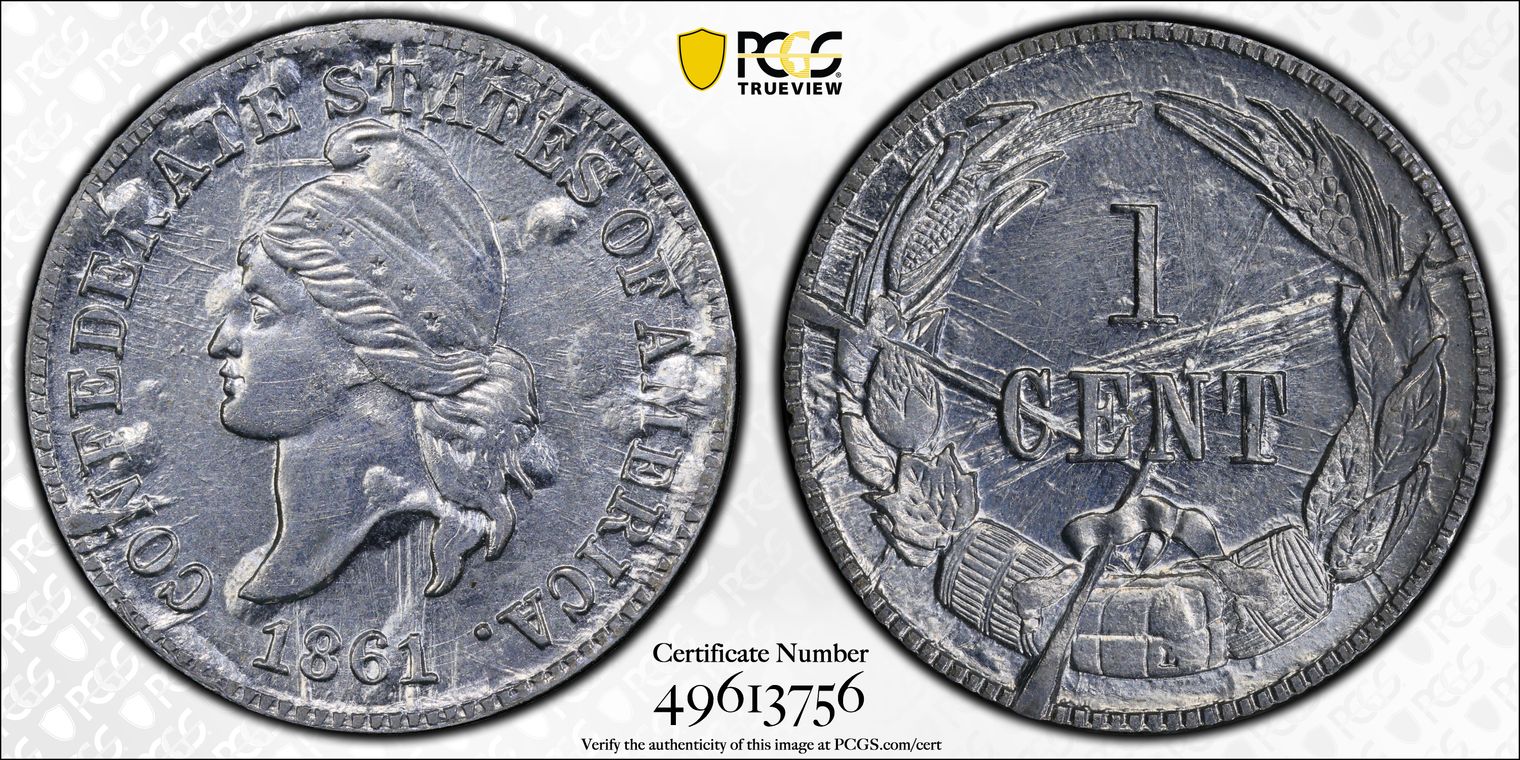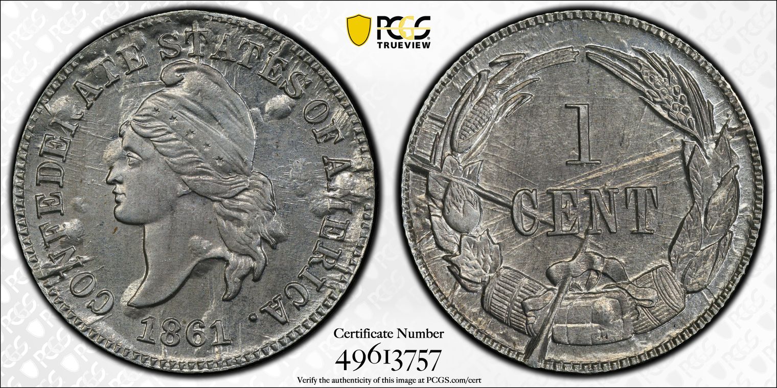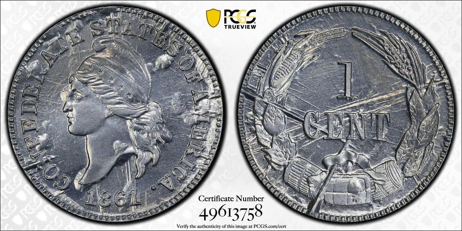 CAC - 1861 Confederate States of America Cent Haseltine Restrike of 1874 Struck in Copper from the Original Robert Lovett Dies. The only CAC endorsed example. "Under a lamp, considerable mint red outlines the devices and legends on both sides, with some lovely brown and purple field accents. Mirrorlike reflectivity glistens around the devices." Ex: Houston Signature (Heritage, 11/2012).