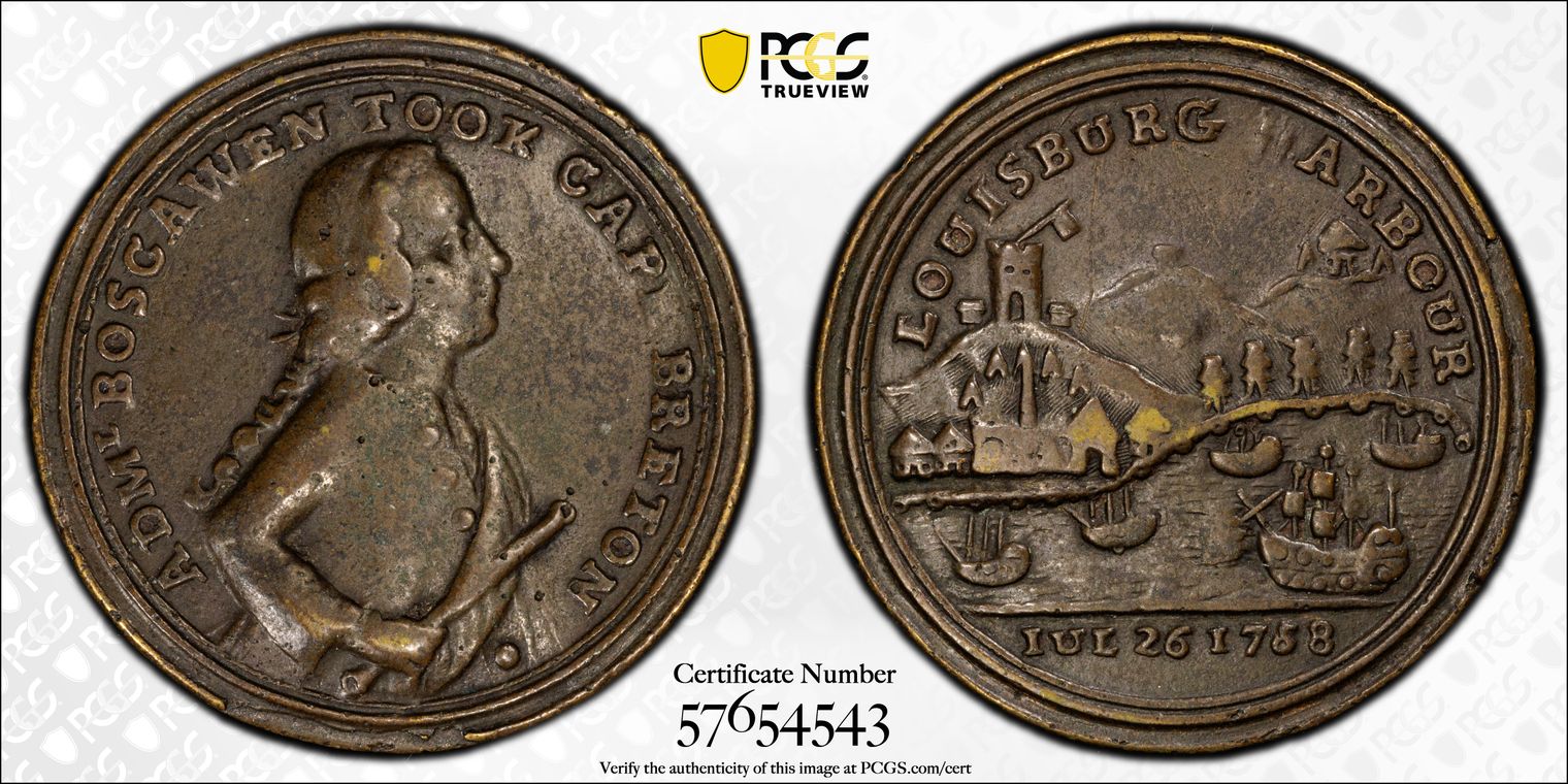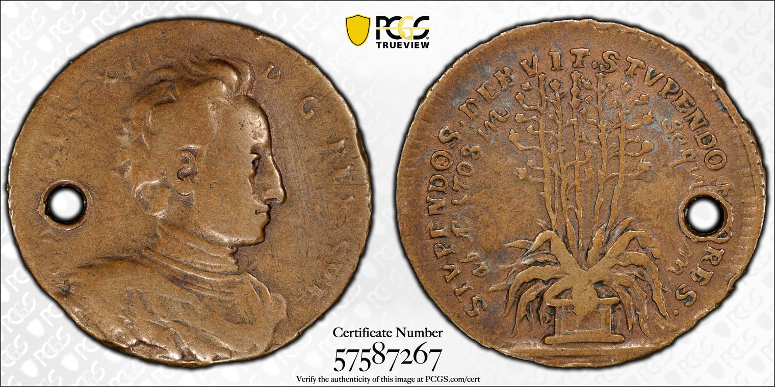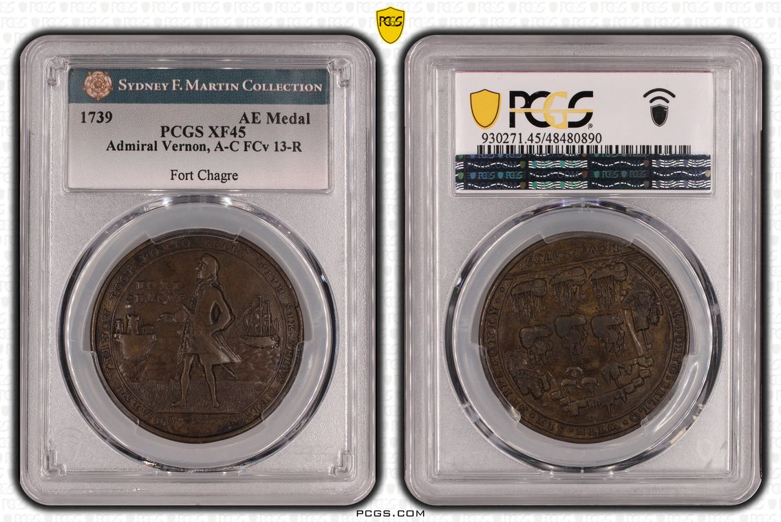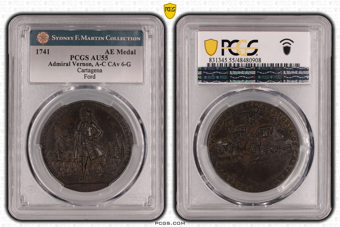 Undated Admiral Vernon Medal. Porto Bello with Vernon's Portrait and Icons. Adams-Chao PBvi 25-OO, M-G 83. Rarity-6. Pinchbeck, fashioned into the top of a corkscrew. Very Fine, Corroded. 34.5 mm x 36.2 mm. 170.4 grains. Laterally oblong on pinchbeck, fashioned into the top of a corkscrew. The edges are a bit eroded and the screw is missing, but the legends are full. There is a bit of tin pest showing as bubbly surfaces. Interestingly, this is from the dies that produced the only known gold Vernon medal. Provenance: From the Sydney F. Martin Collection. Purchased from John Kraljevich, August 14, 2010.