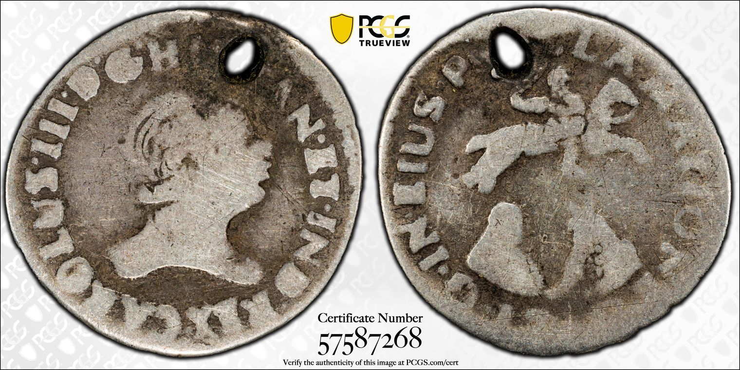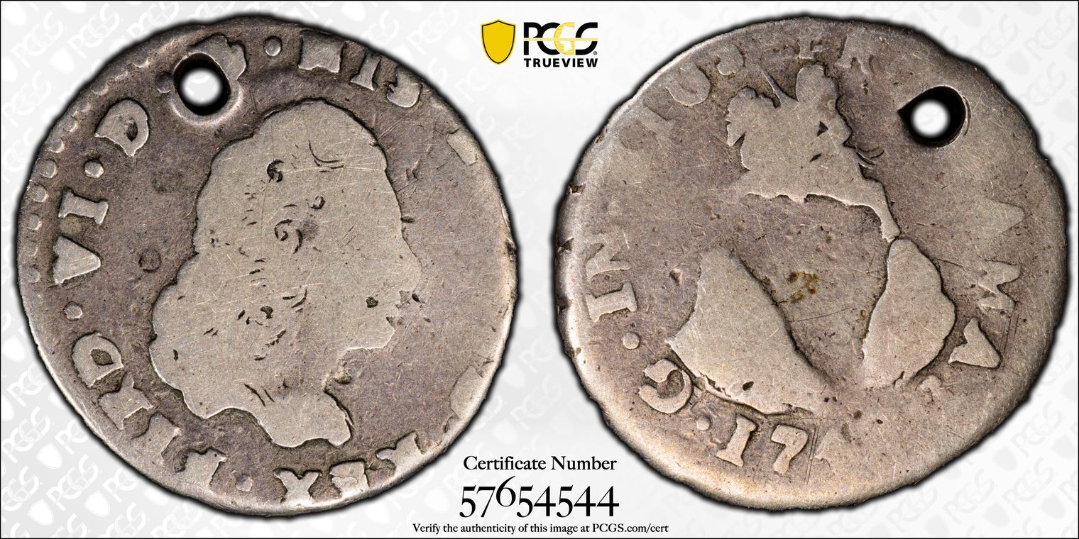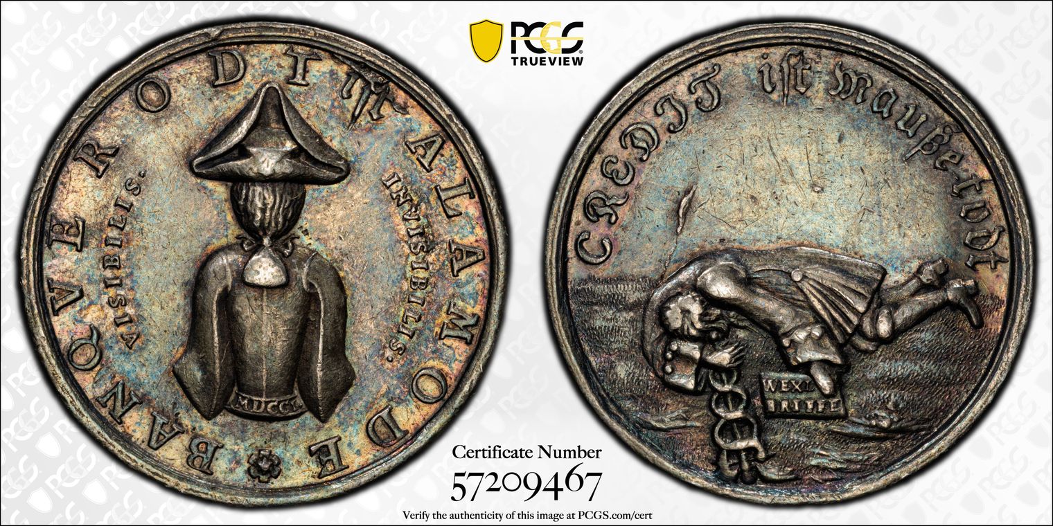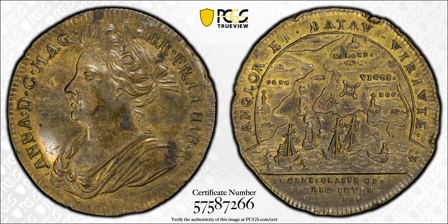 Undated Admiral Vernon Medal. Porto Bello with Vernon's Portrait and Icons. Adams-Chao PBvi 25-OO, M-G 83. Rarity-6. Pinchbeck, fashioned into the top of a corkscrew. Very Fine, Corroded. 34.5 mm x 36.2 mm. 170.4 grains. Laterally oblong on pinchbeck, fashioned into the top of a corkscrew. The edges are a bit eroded and the screw is missing, but the legends are full. There is a bit of tin pest showing as bubbly surfaces. Interestingly, this is from the dies that produced the only known gold Vernon medal. Provenance: From the Sydney F. Martin Collection. Purchased from John Kraljevich, August 14, 2010.