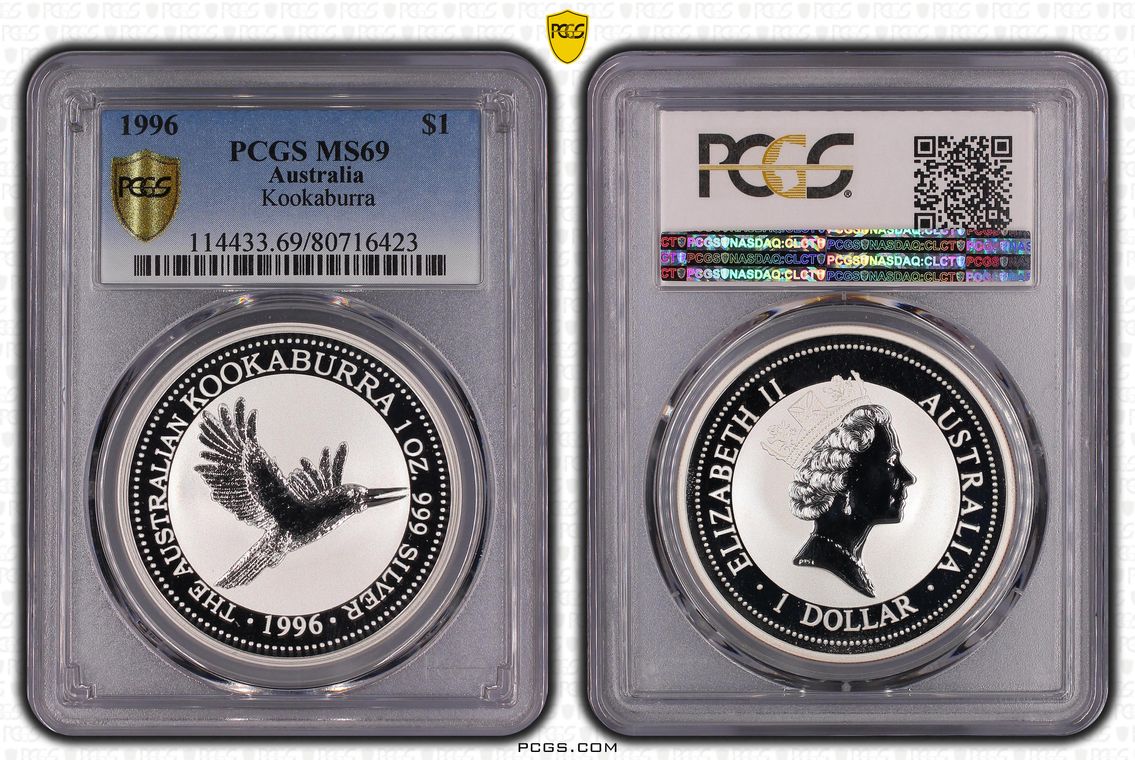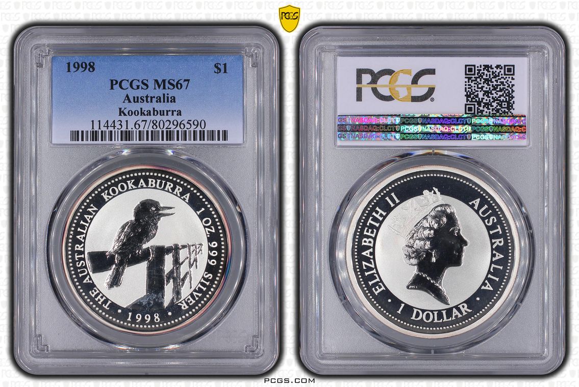 1990 Australian $5 1oz Silver MS68 Kookaburra. ((Should be SP or PR as has never been in Circulation.)) Or out of caps until put in Slab.