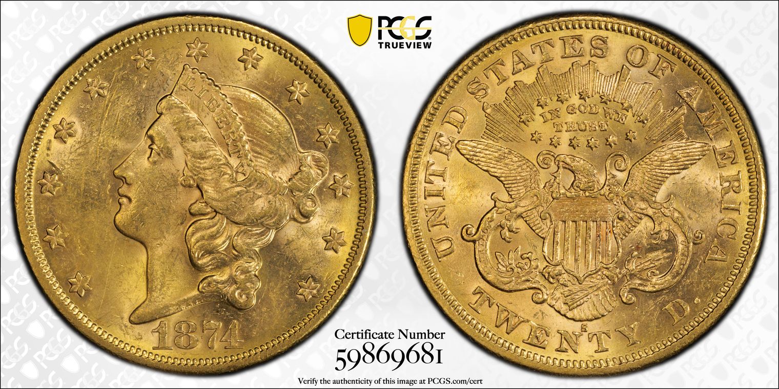 1874-S $20 AU58