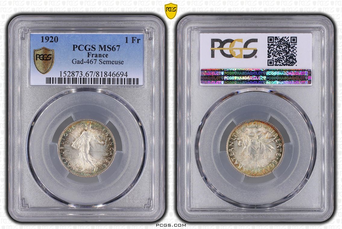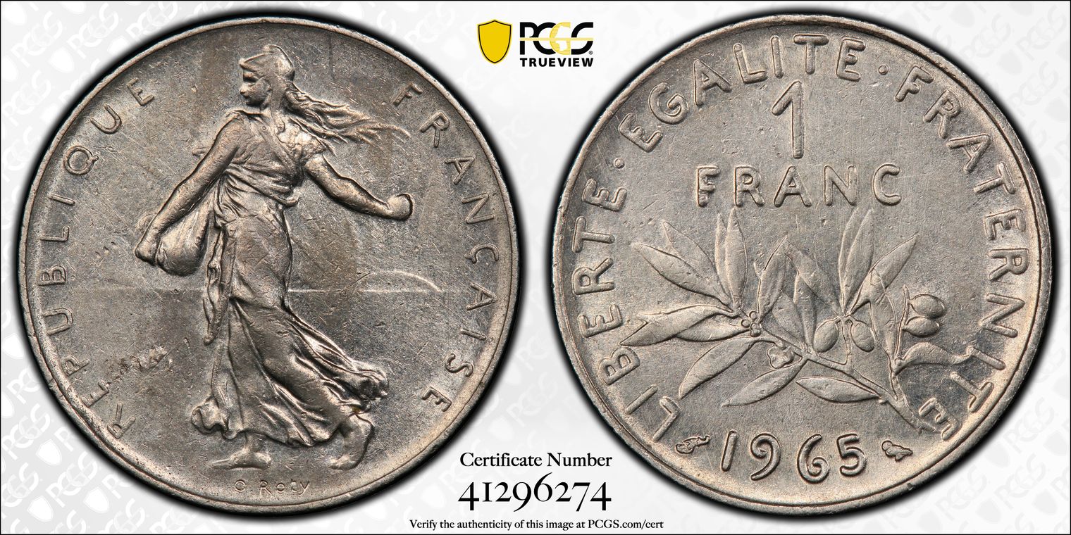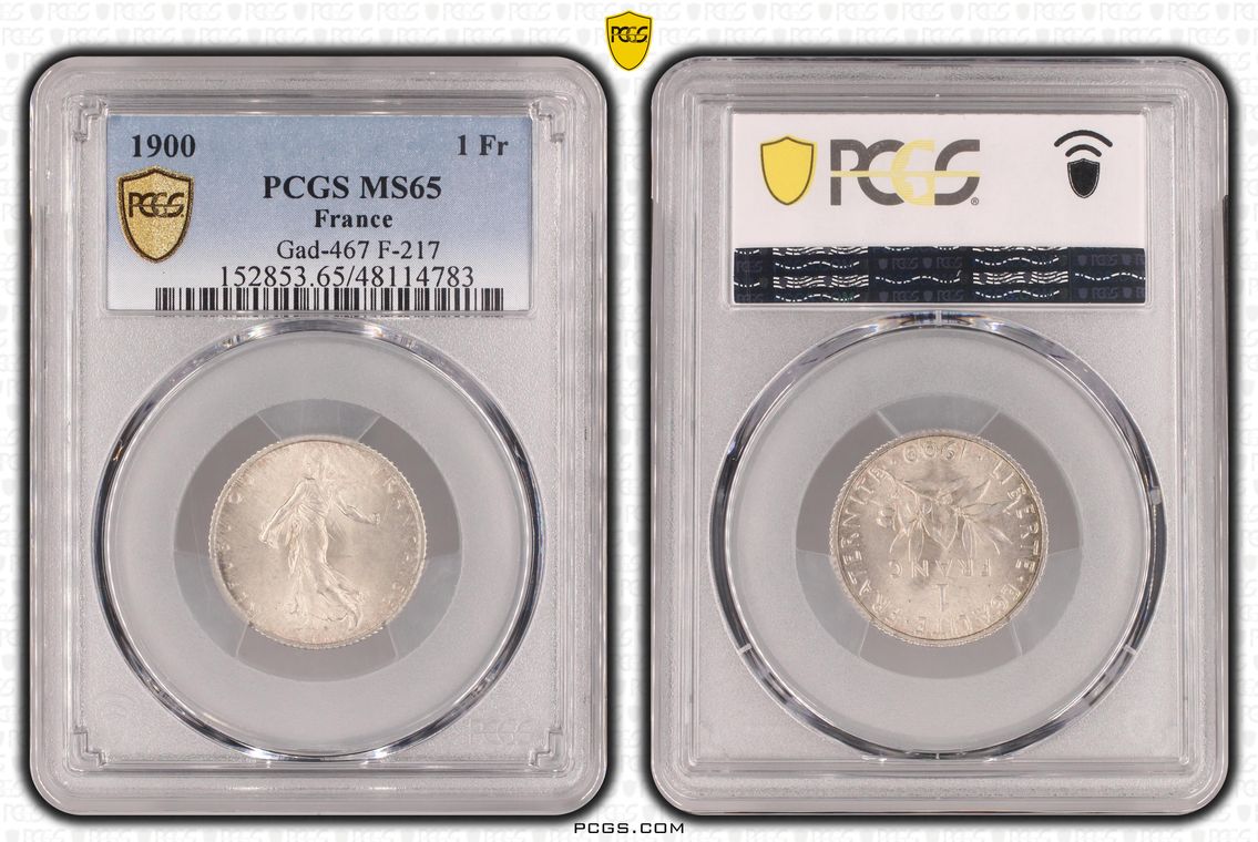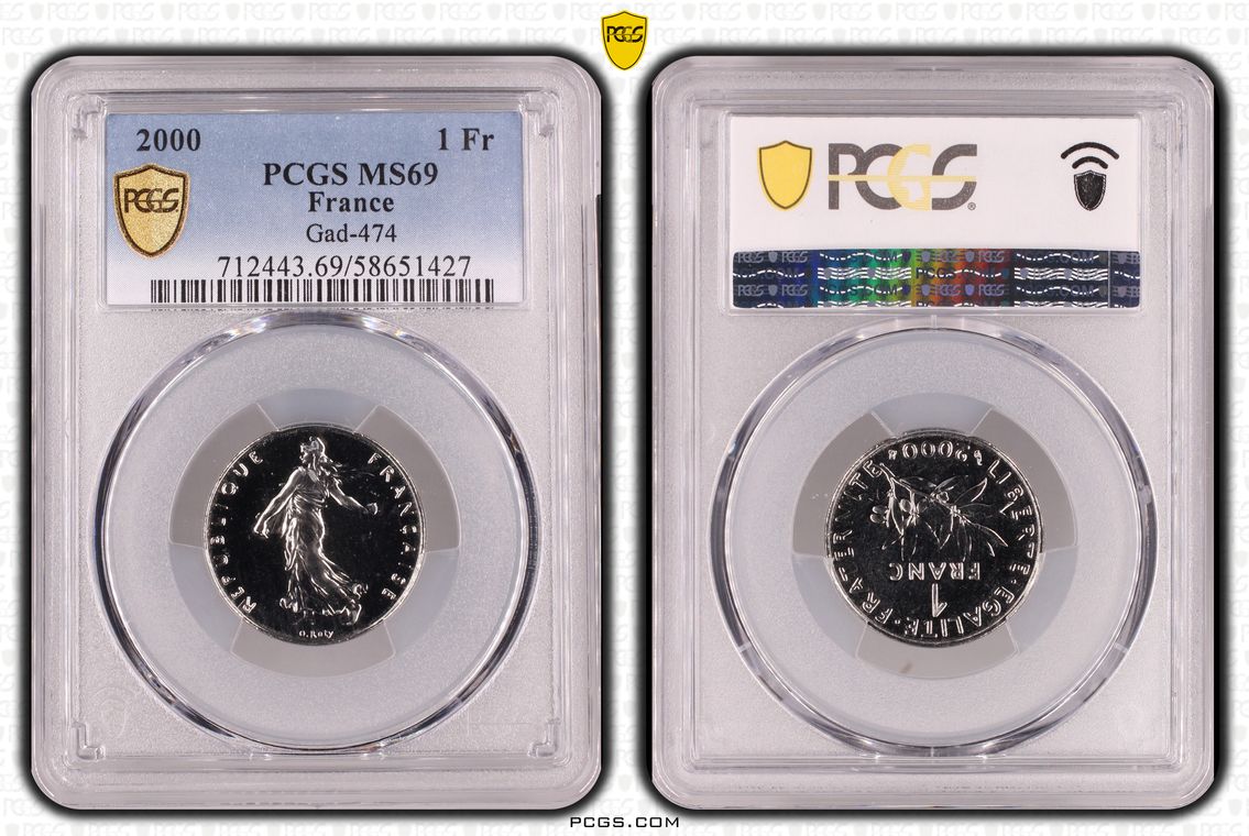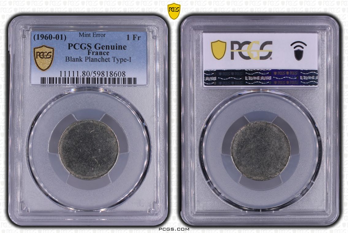 Flan de 1 franc Semeuse, nickel Qualité SUP+ mais PCGS ne grade pas les flans vierges. Ces pièces rentrent dans la catégorie générique #11111 affectée par défaut aux États-Unis... Nom de l'atelier/ville : Paris Diamètre : 23,50 mm Poids : 6,01 g.