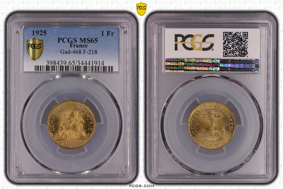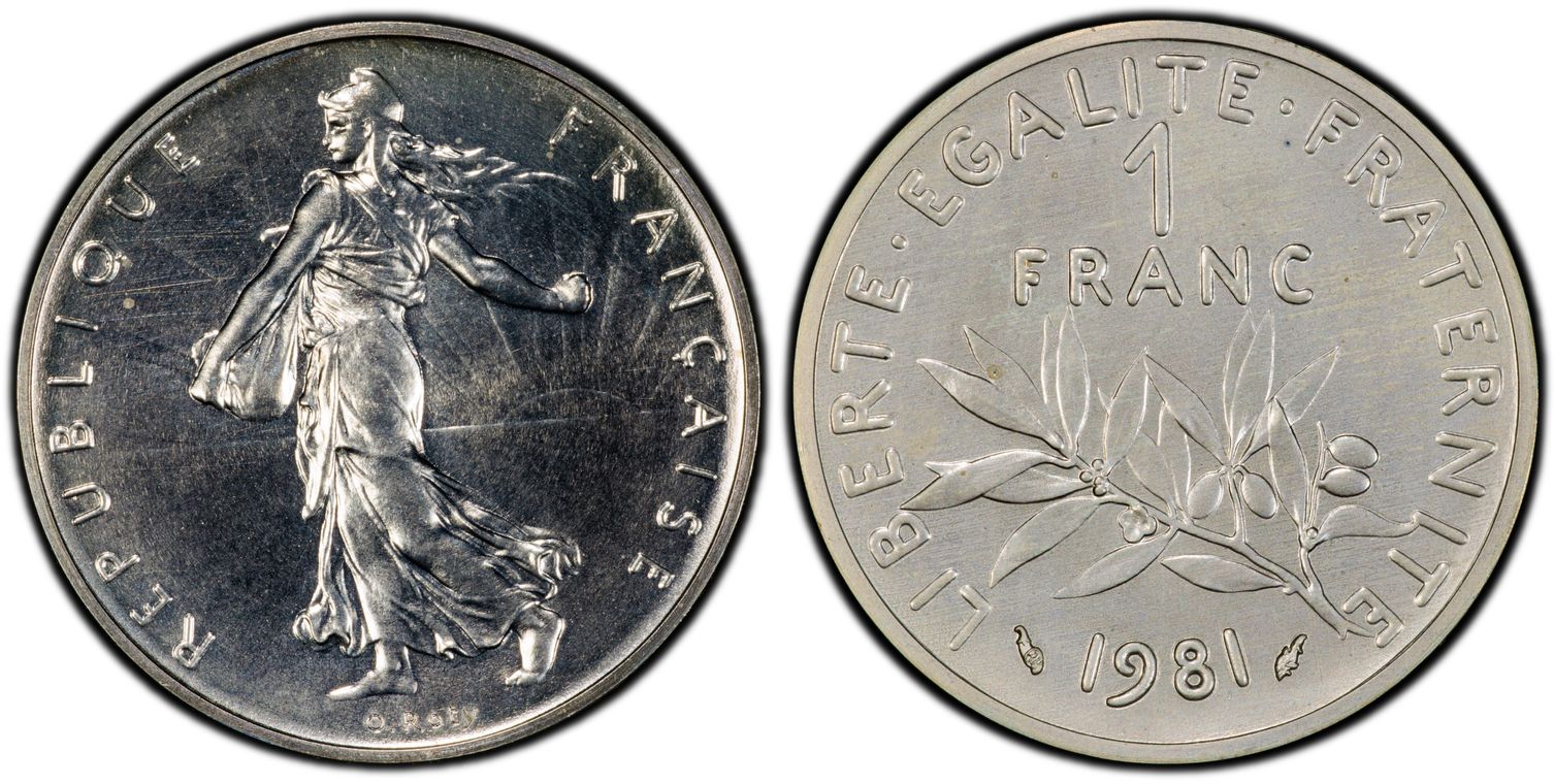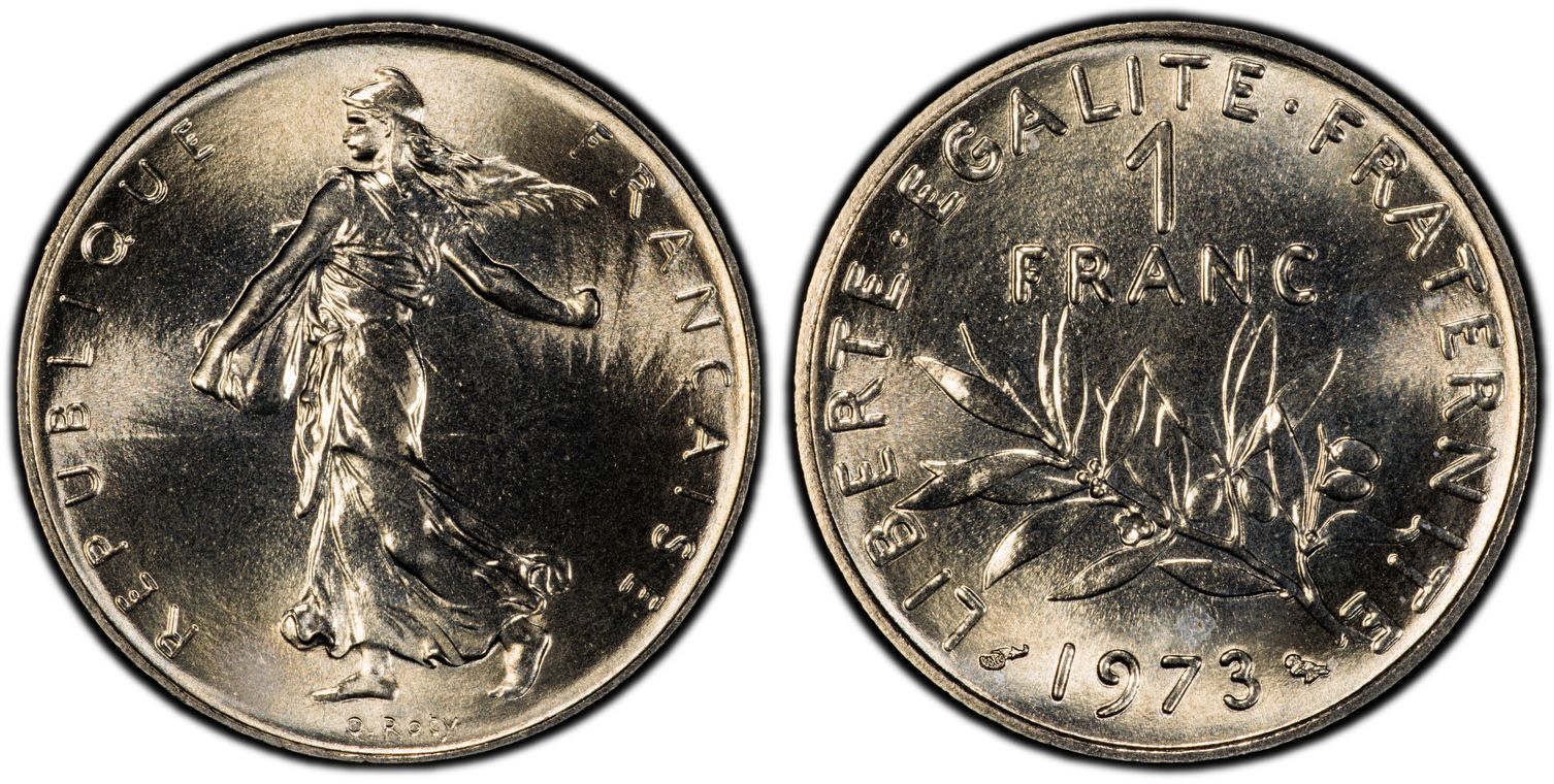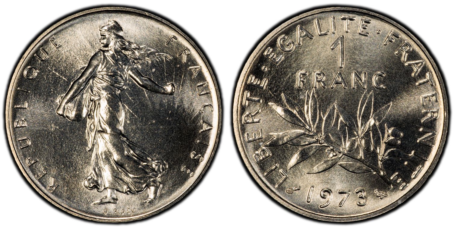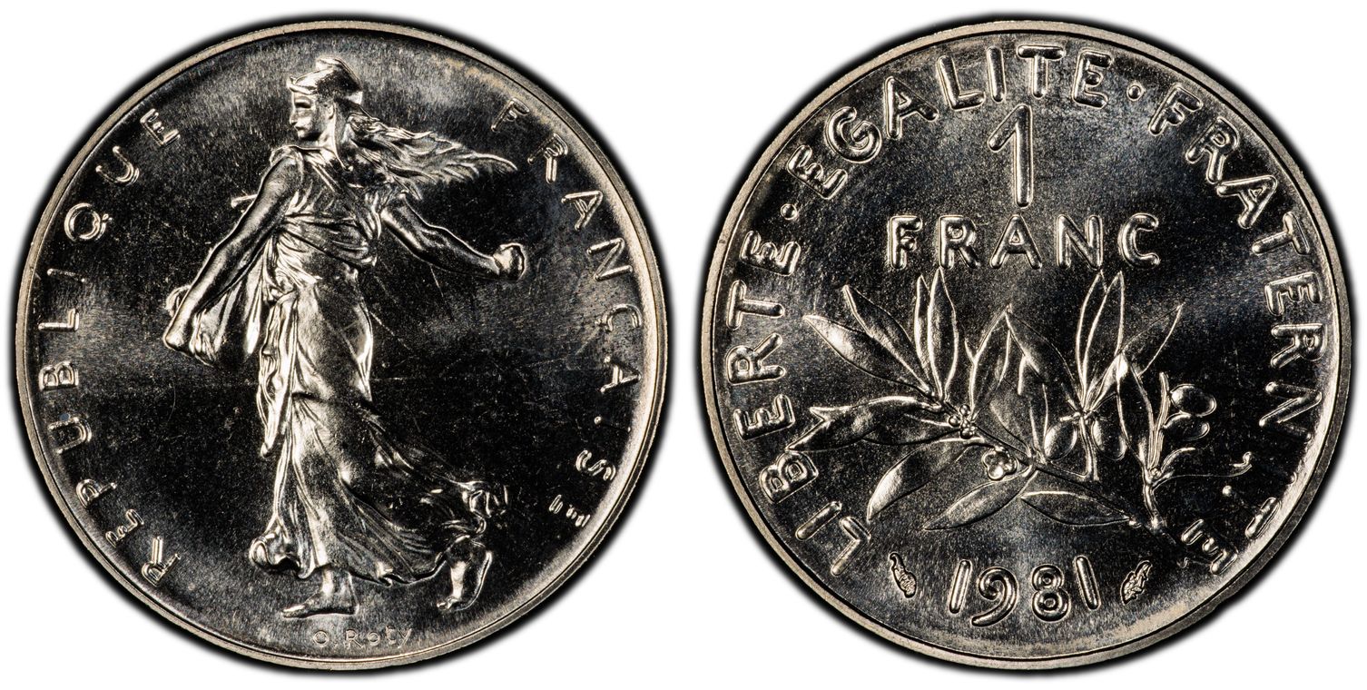 Flan de 1 franc Semeuse, nickel Qualité SUP+ mais PCGS ne grade pas les flans vierges. Ces pièces rentrent dans la catégorie générique #11111 affectée par défaut aux États-Unis... Nom de l'atelier/ville : Paris Diamètre : 23,50 mm Poids : 6,01 g.