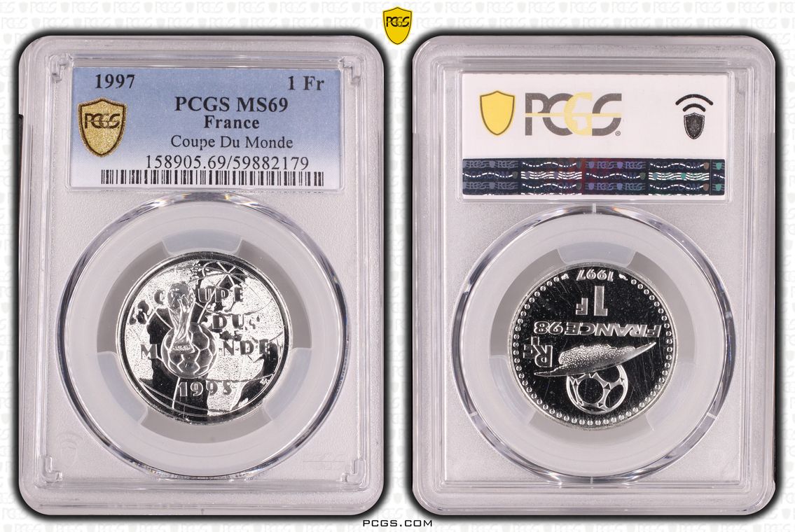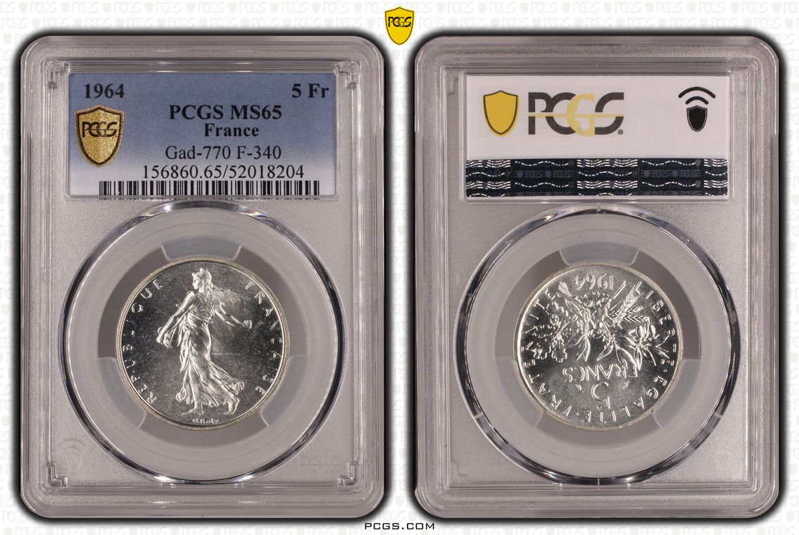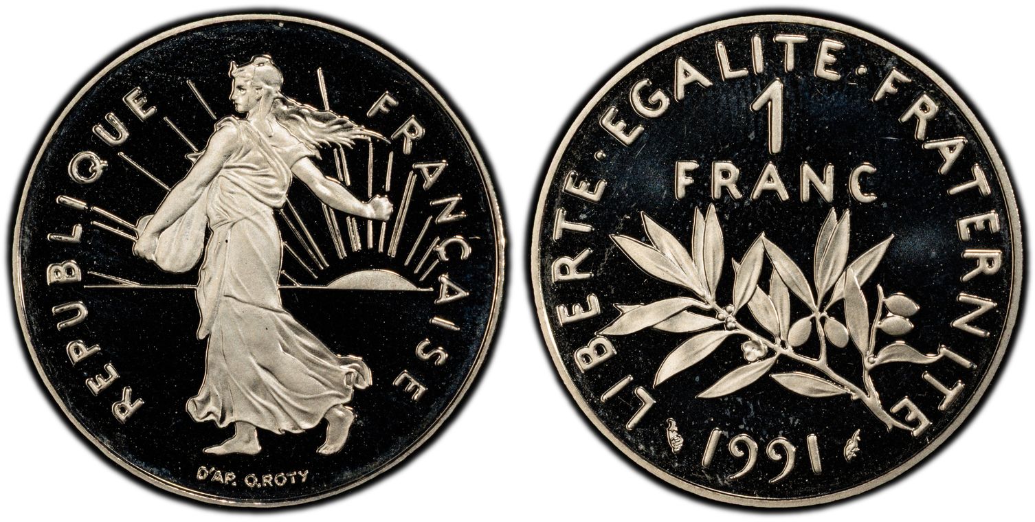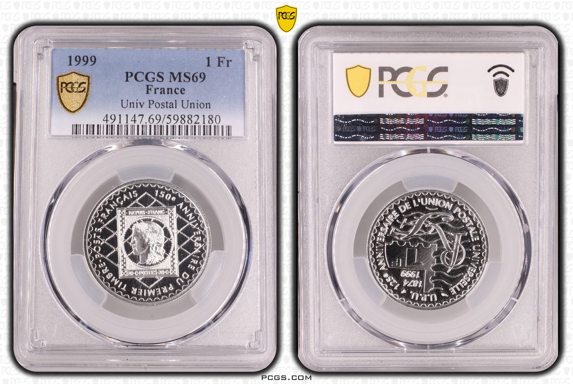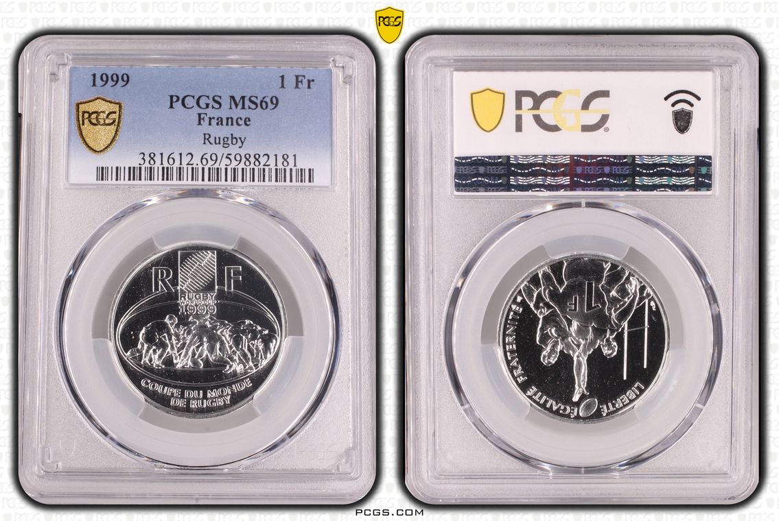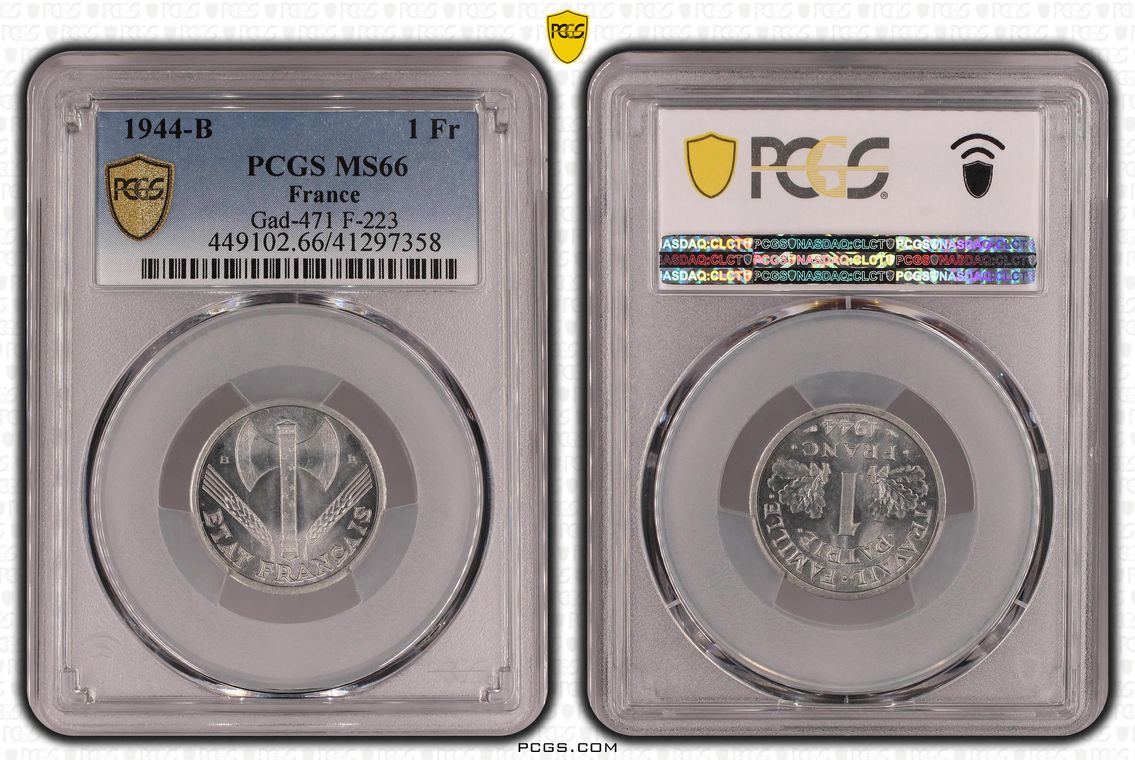 Flan de 1 franc Semeuse, nickel Qualité SUP+ mais PCGS ne grade pas les flans vierges. Ces pièces rentrent dans la catégorie générique #11111 affectée par défaut aux États-Unis... Nom de l'atelier/ville : Paris Diamètre : 23,50 mm Poids : 6,01 g.