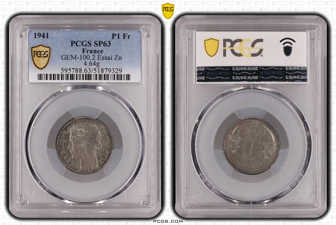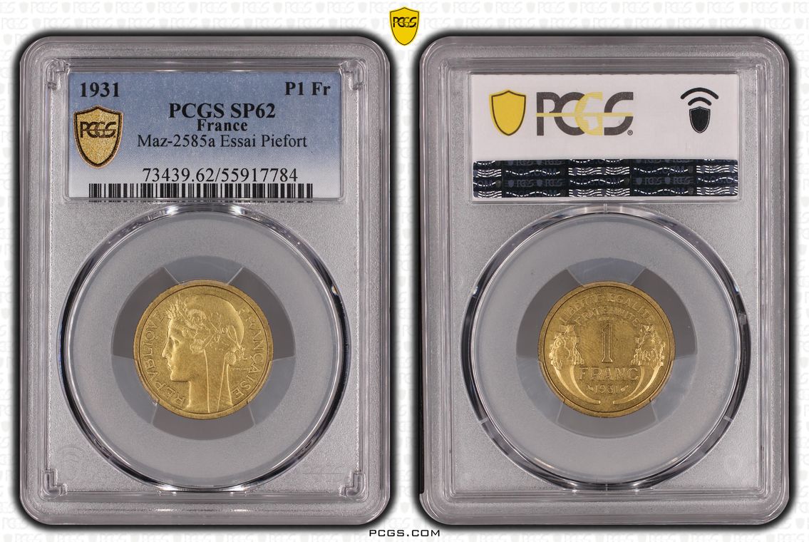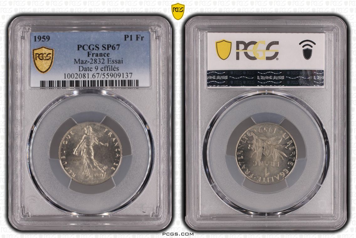 Variété peu courante de la 1F Essai 1959 (Seul exemplaire gradé) : 5 bas 1 bas. Ces variétés ont été repérées et publiées par Laurent Bonneau (PCGS) dans le bulletin numismatique 225 de CGB.