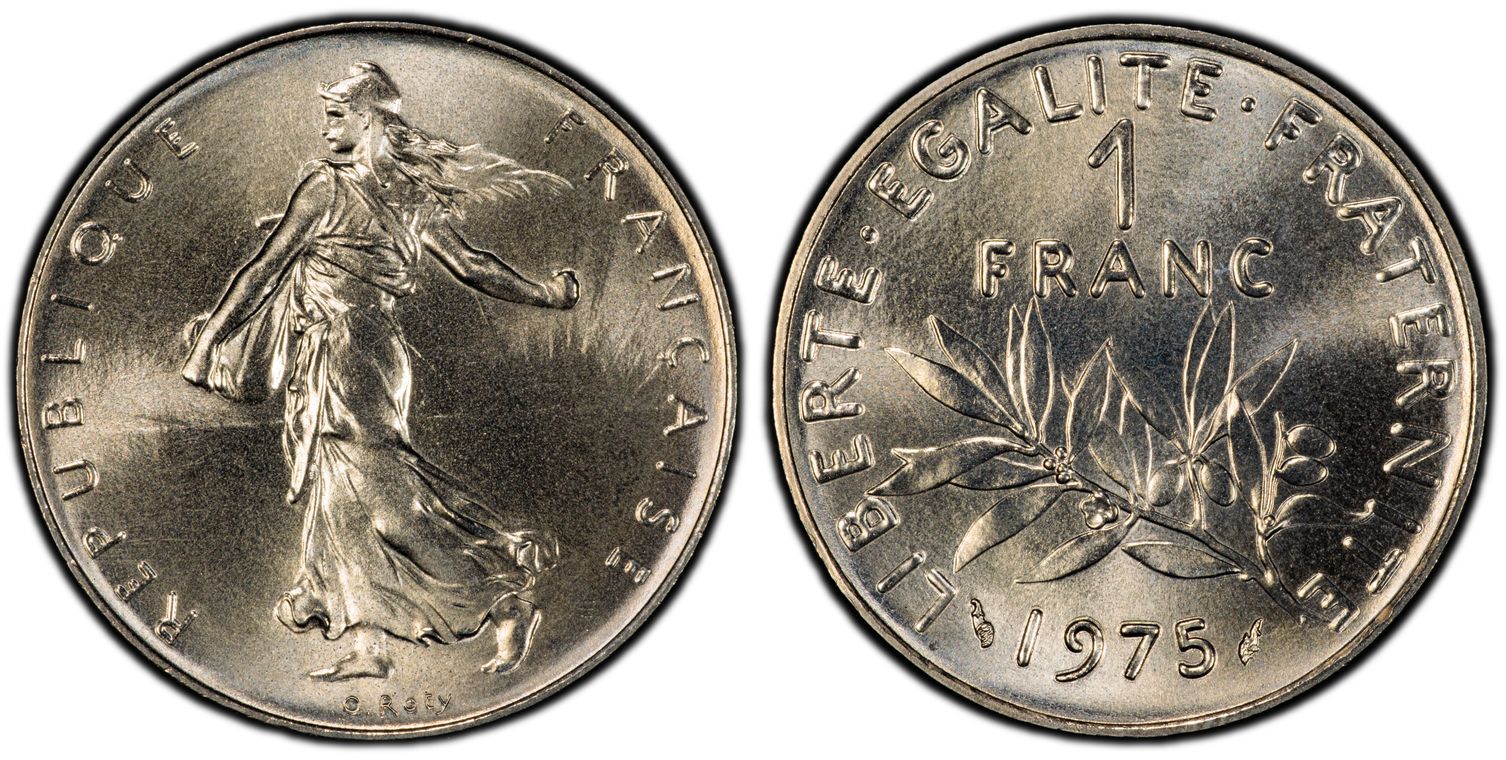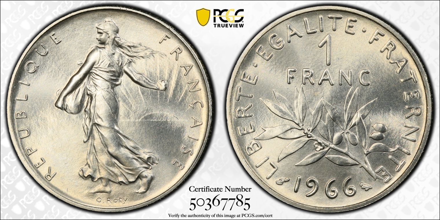Ve République (1958 à nos jours). 1 franc Semeuse sur flan de 20 centimes Lagriffoul en cupro-nickel-aluminium 1966, Paris. GEM.104.25 = cet exemplaire ! (Unique) ; Cupro-nickel aluminium - 4,09 g - 24 mm - 6 h Top Pop : c’est le seul exemplaire gradé ! C’est le seul exemplaire connu qui provient de la collection Carl F. Chirico, vente Bowers et Merena, 28 février au 1er mars 2008, n° 5656. NGC MS 63 MINT ERROR ON 20C PLANCHET (8235285-036). Avec une patine consécutive aux manipulations qui ont laissé de légères traces dans les champs. Unique. Superbe à Fleur de coin.