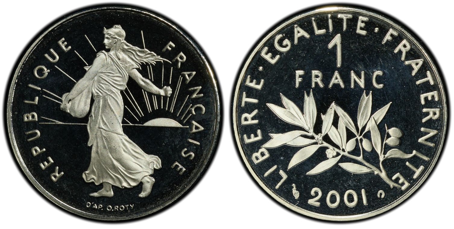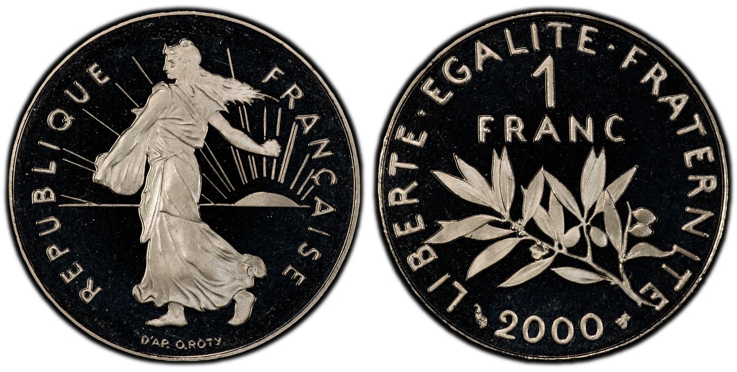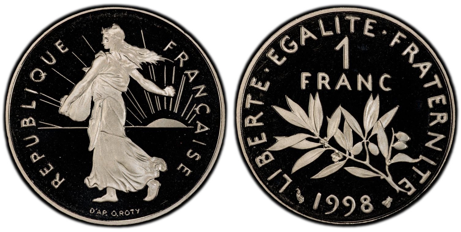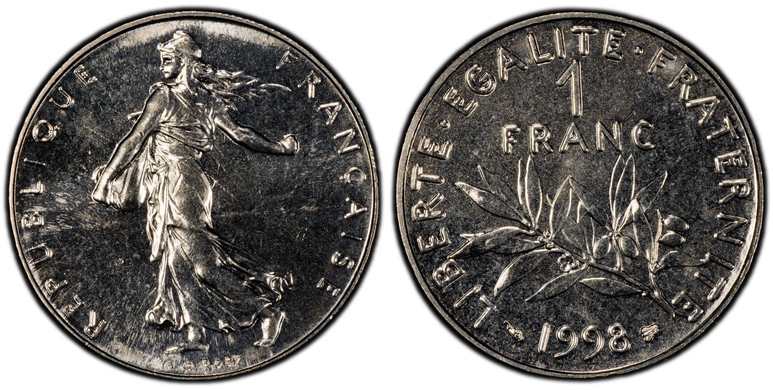 Avant le passage à l'euro, la Monnaie de Paris, en collaboration avec la griffe du designer Philippe Starck, décide de frapper la dernière monnaie en franc : 1 franc appelé "l'ultime franc". Il y a eu 4963 exemplaires de pièce d'or. La pièce d'1 Franc Ultime pèse 26,1 grammes et mesure 33 mm. Son titrage est de 750/1000. - L'avers de la pièce représente un unique élément de la composition étant le décentrage du chiffre 1, symbolisant la disparition du franc. - Sur le revers, nous pouvons lire : ultime franc. Les techniciens de l'institution ont conçu minutieusement les outillages de cette monnaie aux formes ondulées, à la tranche inscrite et aux reliefs en méplat. Malheureusement la capsule en plastique dans laquelle elle était vendue a souvent laissé des traces sur la surface de la pièce ou sur la tranche.