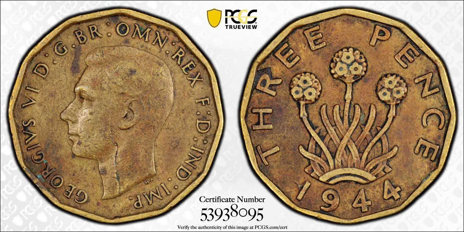 PCGS authenticated this 1944 Great Britain brass threepence (S-4112) as a genuine Mint Error – Obverse Lamination. The defect runs across King George VI’s portrait, exposing a distinct split in the planchet metal from minting. Certified VF35, it displays strong detail and attractive even toning for the grade. Population report shows 0 others with this error attributed, making this piece uniquely recorded under PCGS cert #53938095. Error likely occurred from an impure alloy mix during the wartime brass planchet production of 1944. Excellent example of a lamination flaw on a World War II–era British coin.