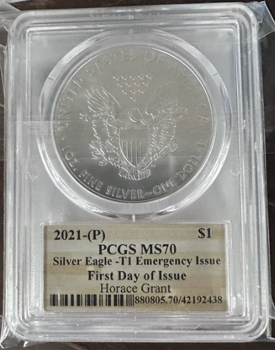 2021-(P) $1 Silver Eagle -T1 Emergency Issue Struck at Philadelphia FDI Horace Grant Red Ink MS70