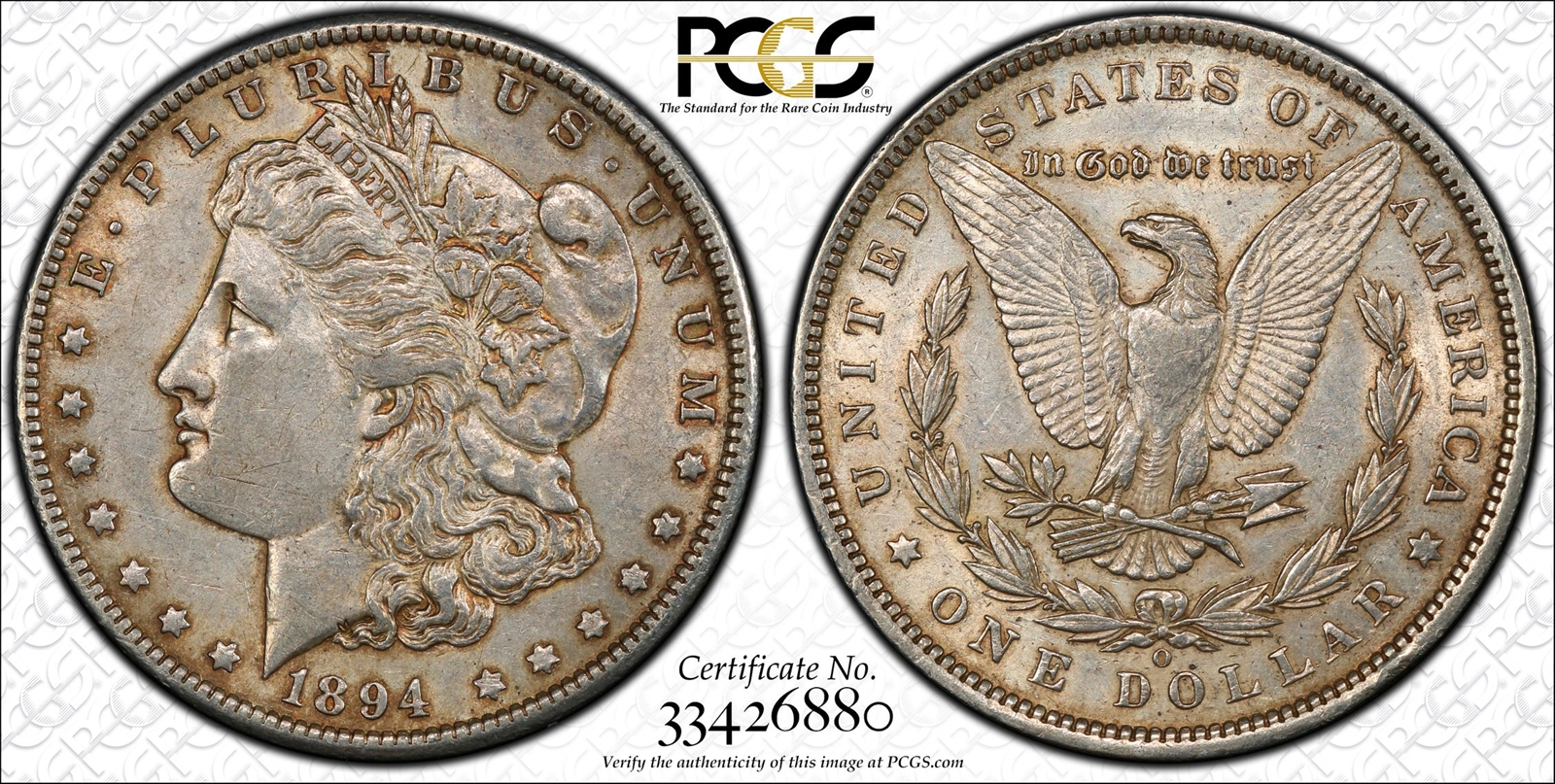 1894 MORGAN SILVER DOLLAR : "One of the Rarest Key Dates of the series" , Mintage - 110,000 (only 1893-S with 100,000 and 1895 are fewer). Purchased as PCGS AU53 in Standard Holder.