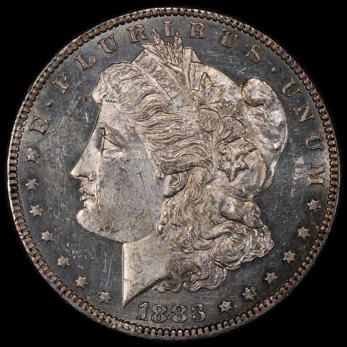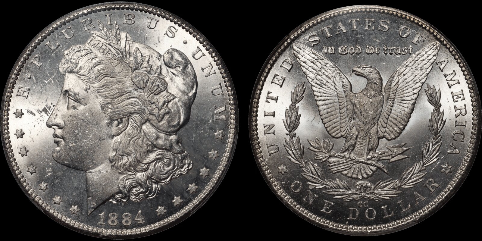 1881 CC $1 Morgan Silver Dollar VAM 2 Doubled 88 & Top Reverse PCGS MS64+. VAM-2 is defined by the visible doubling of both 8's in the date. Further characteristics include a dye scratch that appears between the olive branch and arrow feathers on the reverse and slight doubling of the upper leaves in the left and right wreaths, bottom inside of UNITED STATES OF AMERICA towards rims and tops of IN GOD WE TRUST towards rim.
