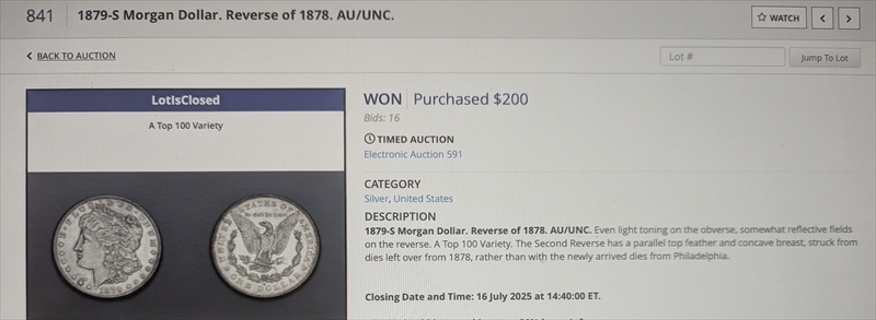 Purchased as slabbed PCGS AU58. Cost was $70 + $5 shipping + $ 4.20 tax. PCGS Standard holder,