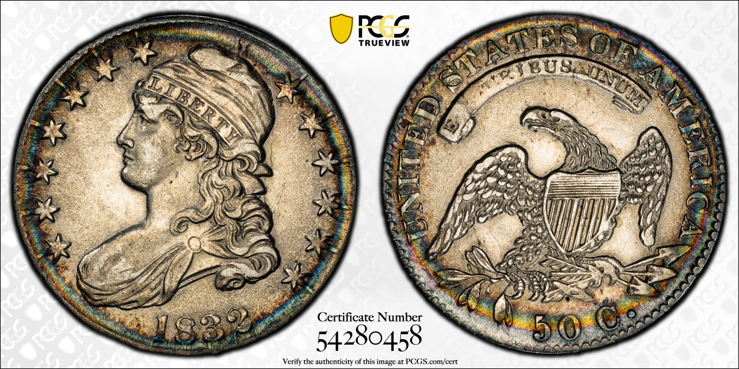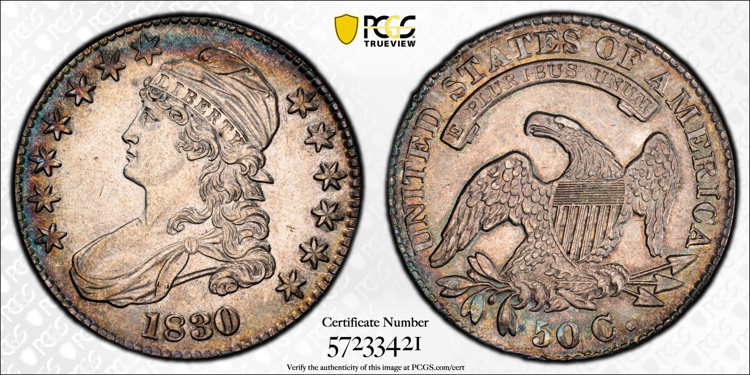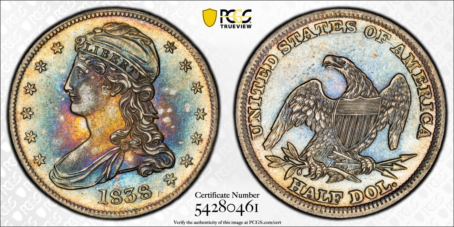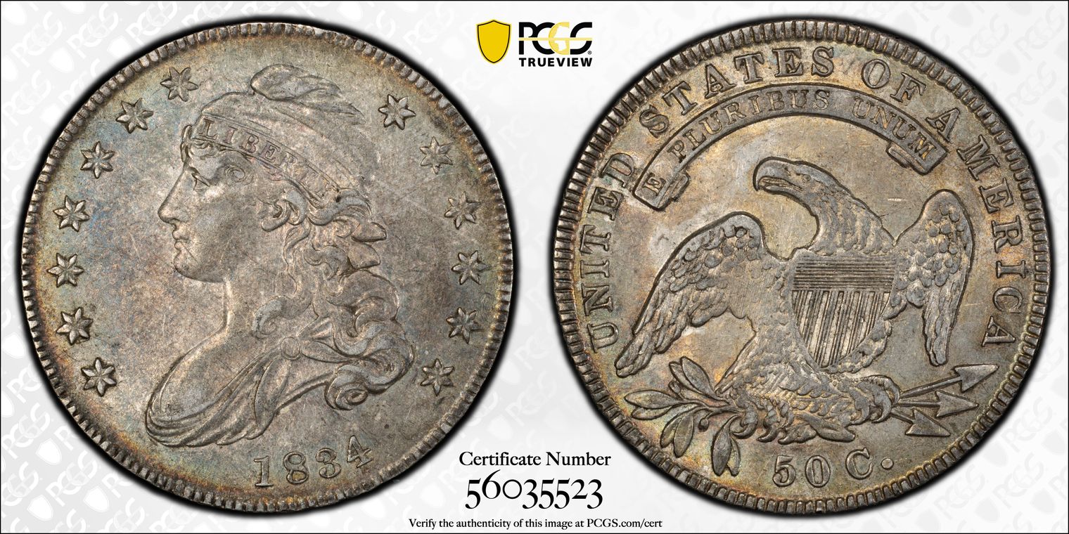 CAC o.102 This coin, and the next lot are two highlights of the present auction. While “only” AU55, these are two of the most stunning bust halves colorwise we have had the honor of offering. Brilliant, frosty silver centers yield to rich, concentric rings of rainbow color, evidence of decades of storage in a Wayte Raymond or other old cardboard album. It is clear that these two lots were a part of the same old time collection. PCGS 144, NGC 32, CAC 21. Throw away the price guides and don’t bother looking at the APRs. This coin is so wonderfully toned that if it was a Morgan dollar, it would garner a 9+ on our 10-point color scale. If the Northern Lights Collector was putting together an AU set of Bust halves, this would be his 1834! How many old time colored halves like this still exist? Good luck finding another! We expect to see world record bids when this one closes.