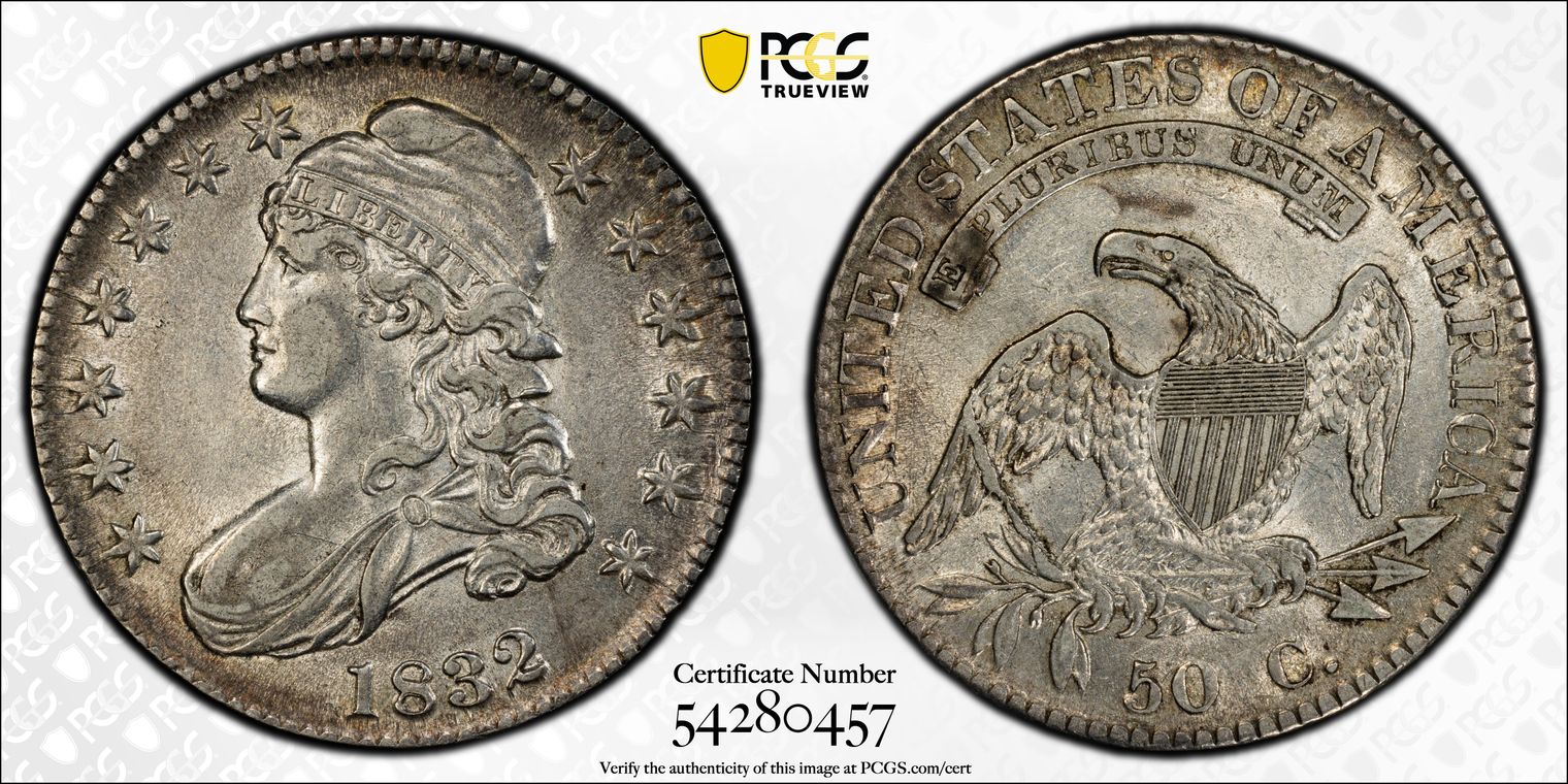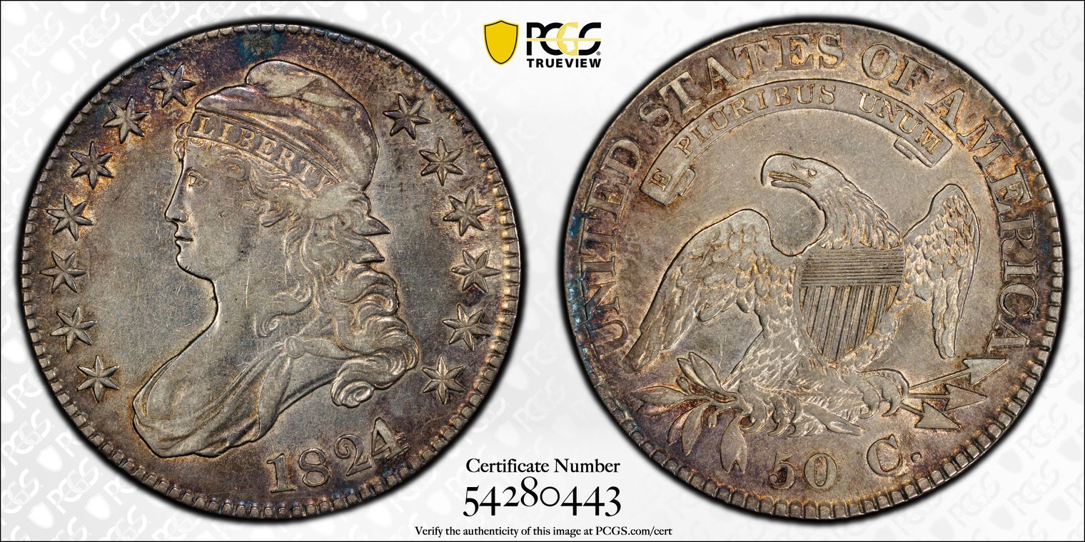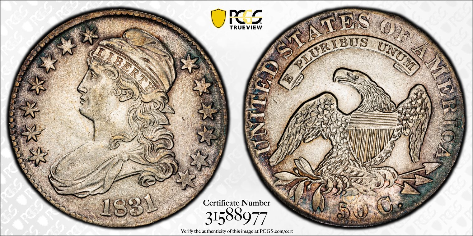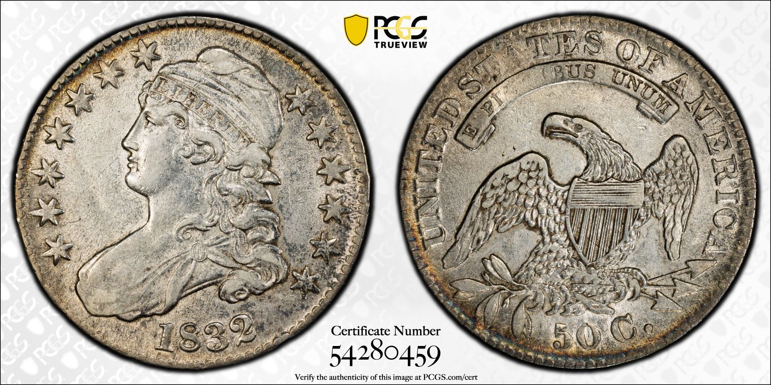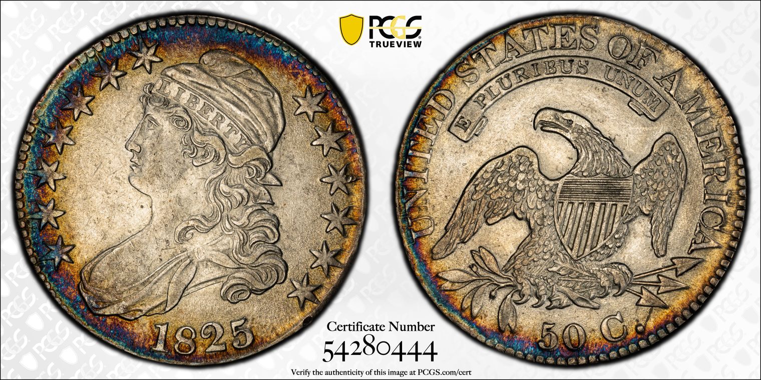 CAC o.102 This coin, and the next lot are two highlights of the present auction. While “only” AU55, these are two of the most stunning bust halves colorwise we have had the honor of offering. Brilliant, frosty silver centers yield to rich, concentric rings of rainbow color, evidence of decades of storage in a Wayte Raymond or other old cardboard album. It is clear that these two lots were a part of the same old time collection. PCGS 144, NGC 32, CAC 21. Throw away the price guides and don’t bother looking at the APRs. This coin is so wonderfully toned that if it was a Morgan dollar, it would garner a 9+ on our 10-point color scale. If the Northern Lights Collector was putting together an AU set of Bust halves, this would be his 1834! How many old time colored halves like this still exist? Good luck finding another! We expect to see world record bids when this one closes.