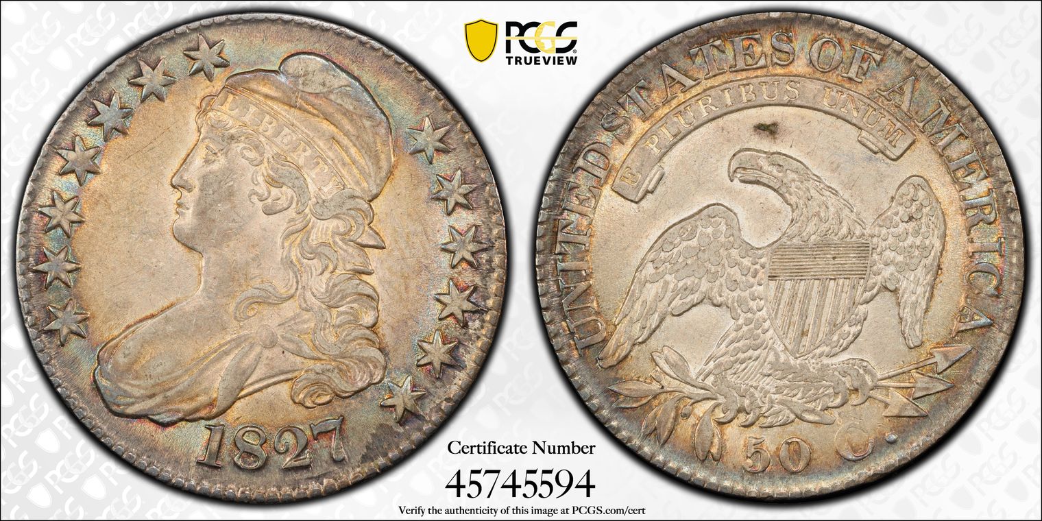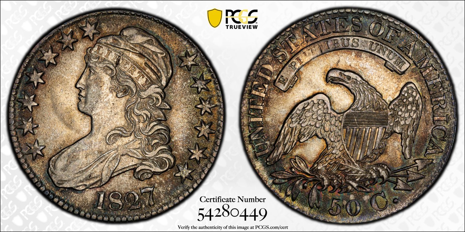 o.142 CAC- The luster on this 1827 is crazy considering the grade. Bright flashy luster hits you and with the toning this coin is a wonderful example of the Square Base 2.