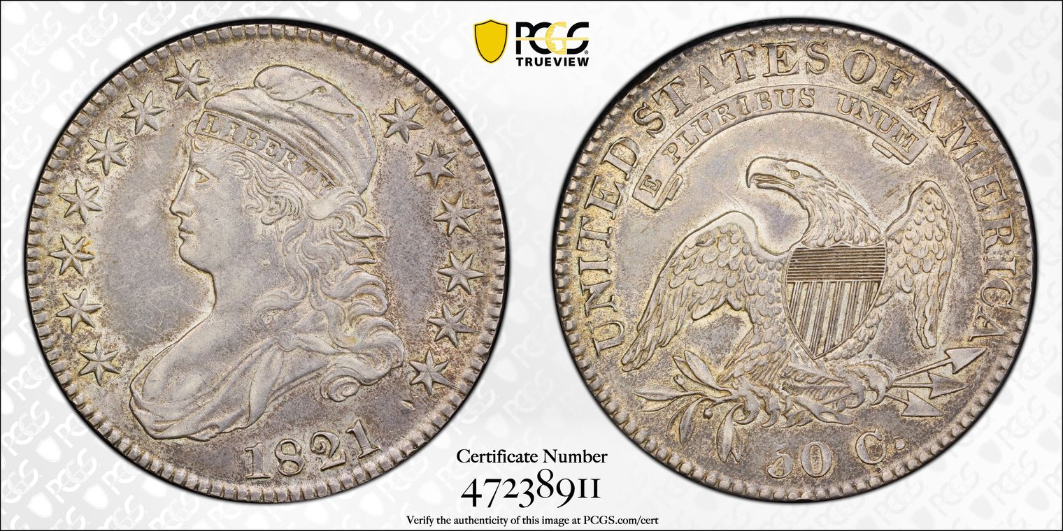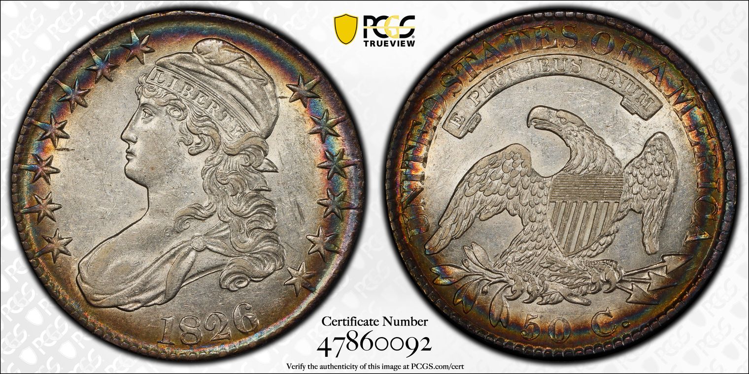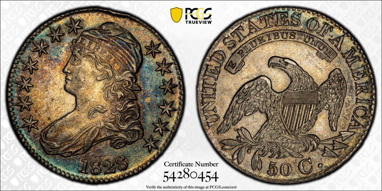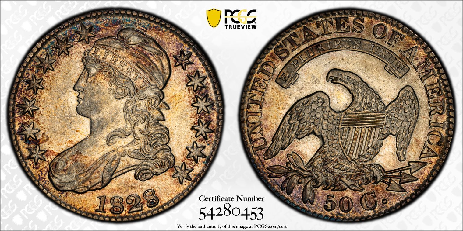 Gold CAC ex. David Sunshine, paradime- Toned. Bust Half. GOLD CAC. Rattler. Better Date. There is a little left you can ask from a Bust Half Dollar. If you needed or wanted only one Bust Half Dollar, this is the coin you would like to buy. We believe PCGS back in the day likely thought the toning on the high point as wear. This present example looks better than most MS62 in todays holder. Regardless of the grade, the coin is under-graded and a monster. With attractive cobalt blue throughout the devices splendidly mixed with splashes of sun-yellow, the coin is a beauty to behold. - Note: When this example was slabbed there was no distinction between Large 8 & Small 8. The correct PCGS # now is 6097 not 6096.