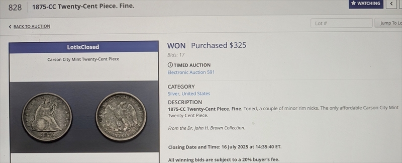 1875-CC TWENTY CENT COIN; purchased raw as "VF" from CNG; graded PCGS VF20 ; Gold Shield