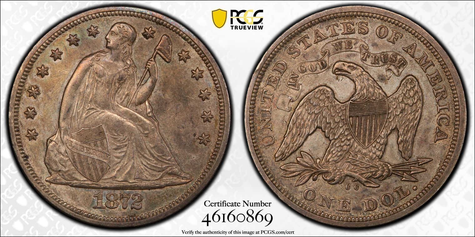 From the Pelican Bay Collection. Pleasing, warm silver-gray surfaces, retain soft mint luster, and a hint of gold toning. This About Uncirculated example displays an extra-bold LIBERTY on the obverse shield and only minor marks plus a few wispy abrasions. Liberty’s upper hair strands lack definition, although the stars are sharp for the grade, and the eagle’s leg is fully feathered. It displays one of the few misplaced digits known among Carson City issues of any denomination, where the top of an errant 1 sits low in the dentils, beneath the stem of the 7 in the date.