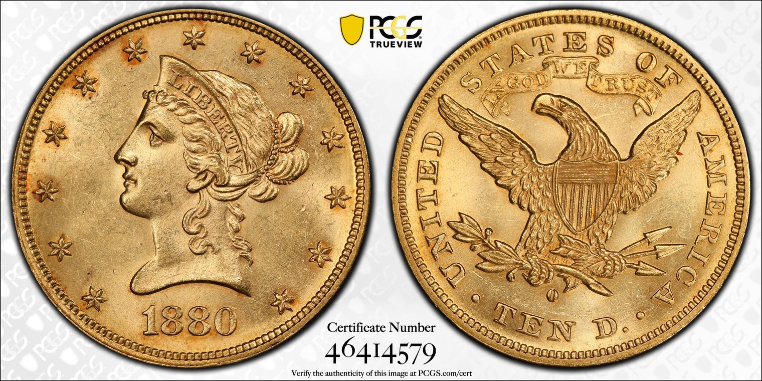 Winter V-1. Ex. SS Republic. In October 1865 after the Civil war ended, the ill-fated sidewheel steamship left New York en route to New Orleans with gold, silver, and commercial cargo to resupply the depleted Southern economy. The ship sank one week later 100 miles SE of Savannah, GA on October 25 in a hurricane. Passengers and crew escaped, but the ship and her booty were lost. In 2003, Odyssey Marine Exploration located the wreck and began the process of recovery. Some amazing rarities came out of the treasure, including the 2 finest known 59-o $10s. Sea salvaged silver coins from the wreck were etched by decades of exposure to salt water. However, the gold coins were largely unaffected. This coin is amazingly well preserved though abraded. I cannot find rub on this coin, but perhaps muted luster on the obverse prevents a higher designation. The protected areas are bright and prooflike, and the reverse is easily MS62. The 1859-o is the rarest "No motto" eagle with a total mintage of 2300 and survival is estimated at 45-55 coins.