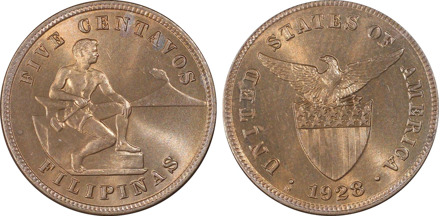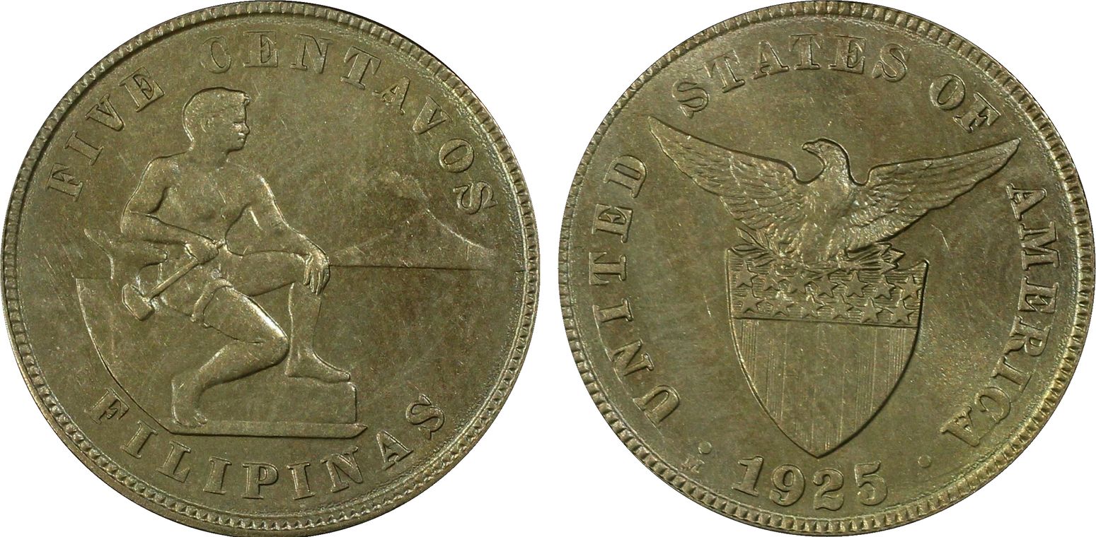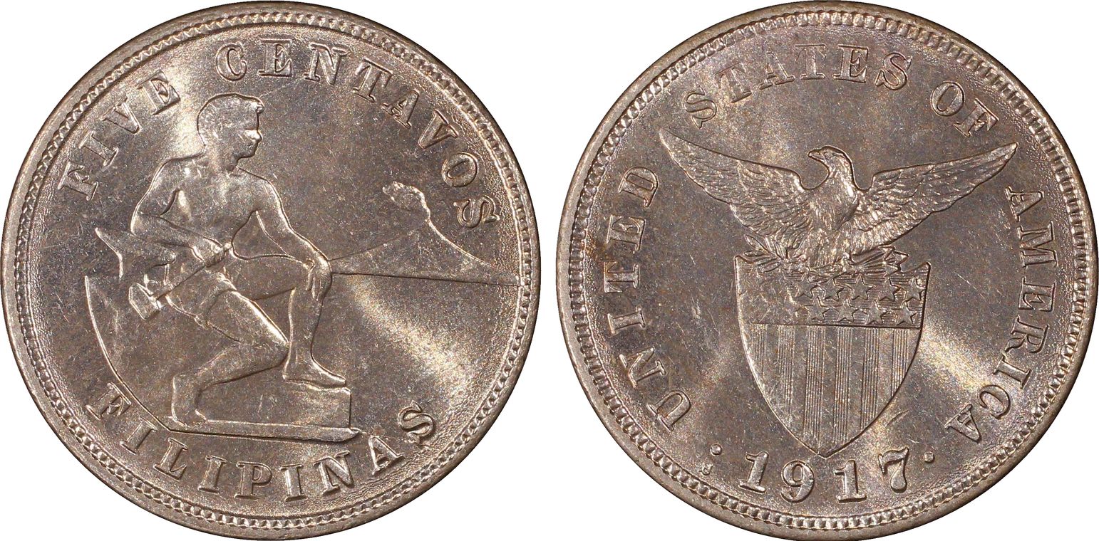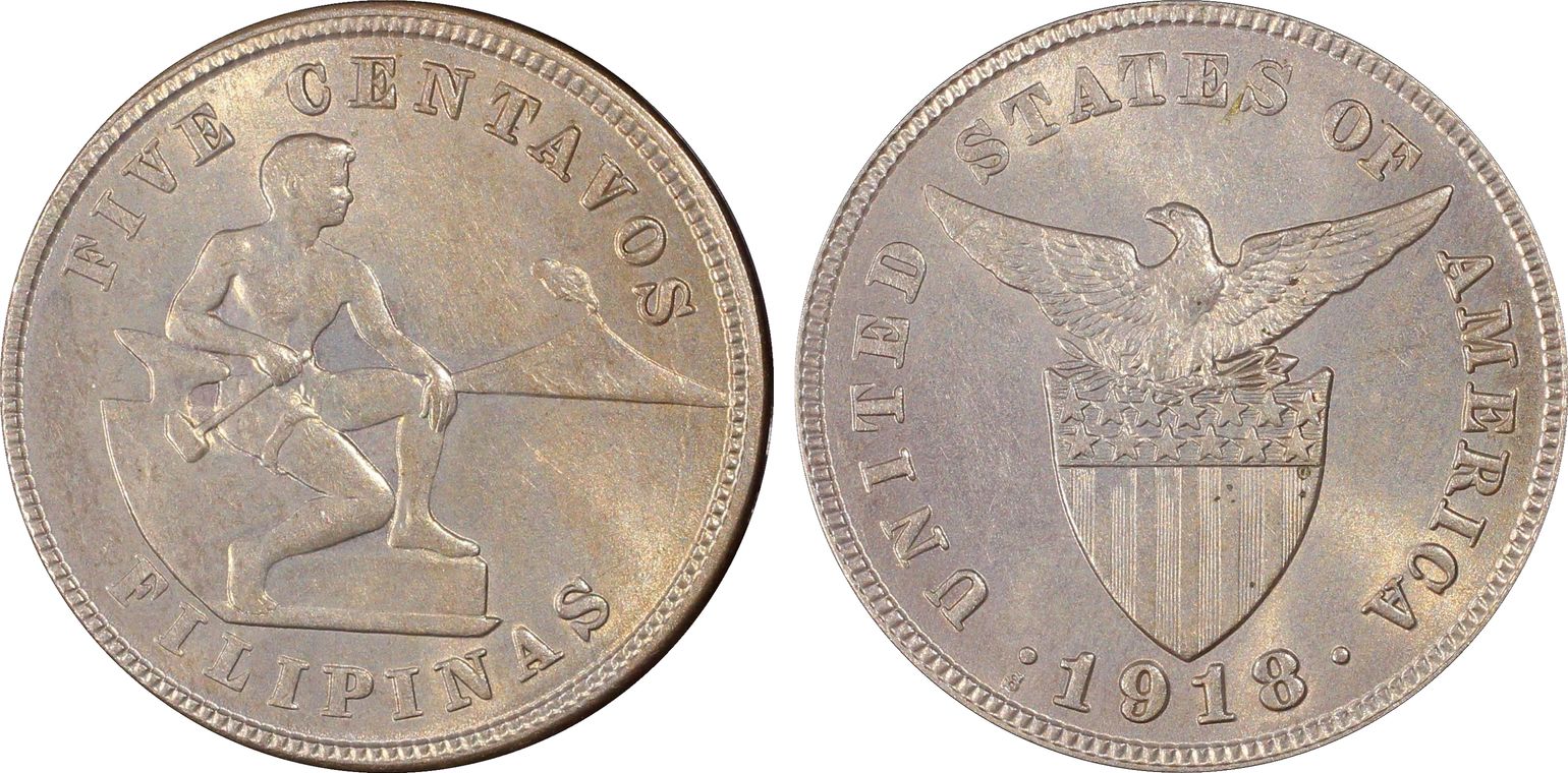 Ex: The Mahal Collection In 1907 the rising price of silver necessitated a reduction in the fineness, size and weight of U.S. Philippine silver coinage. The size of the Twenty Centavo was reduced from 23 mm to 20Ex: The Mahal Collection mm , which was only .5 mm smaller than the then circulating five centavo coin. Since all U.S. Philippine coins used the same basic reverse design mix-ups were bound to happen. In 1918 a Twenty Centavo reverse die was accidently mated with a regular Five Centavo obverse die. Although the exact number of this Muled coin that was produced before the error was discovered is unknown few specimens survive today in any grade and mint state examples are very rare. PCGS has graded only 44 examples in any grade and only 11 of these were Mint state. This Choice Mint State example of the 1918-S Five Centavos Mule is sharply defined and has brilliant luster and excellent eye appeal. This specimen is pedigreed from the Mahal Collection (also known as the "Just Having Fun Collection"). PCGS Population 4 in MS63, 3 finer (8/6/2020)