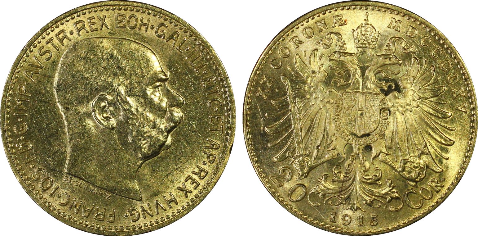 1915 20 Cor KM-2818 Au Restrike MS63