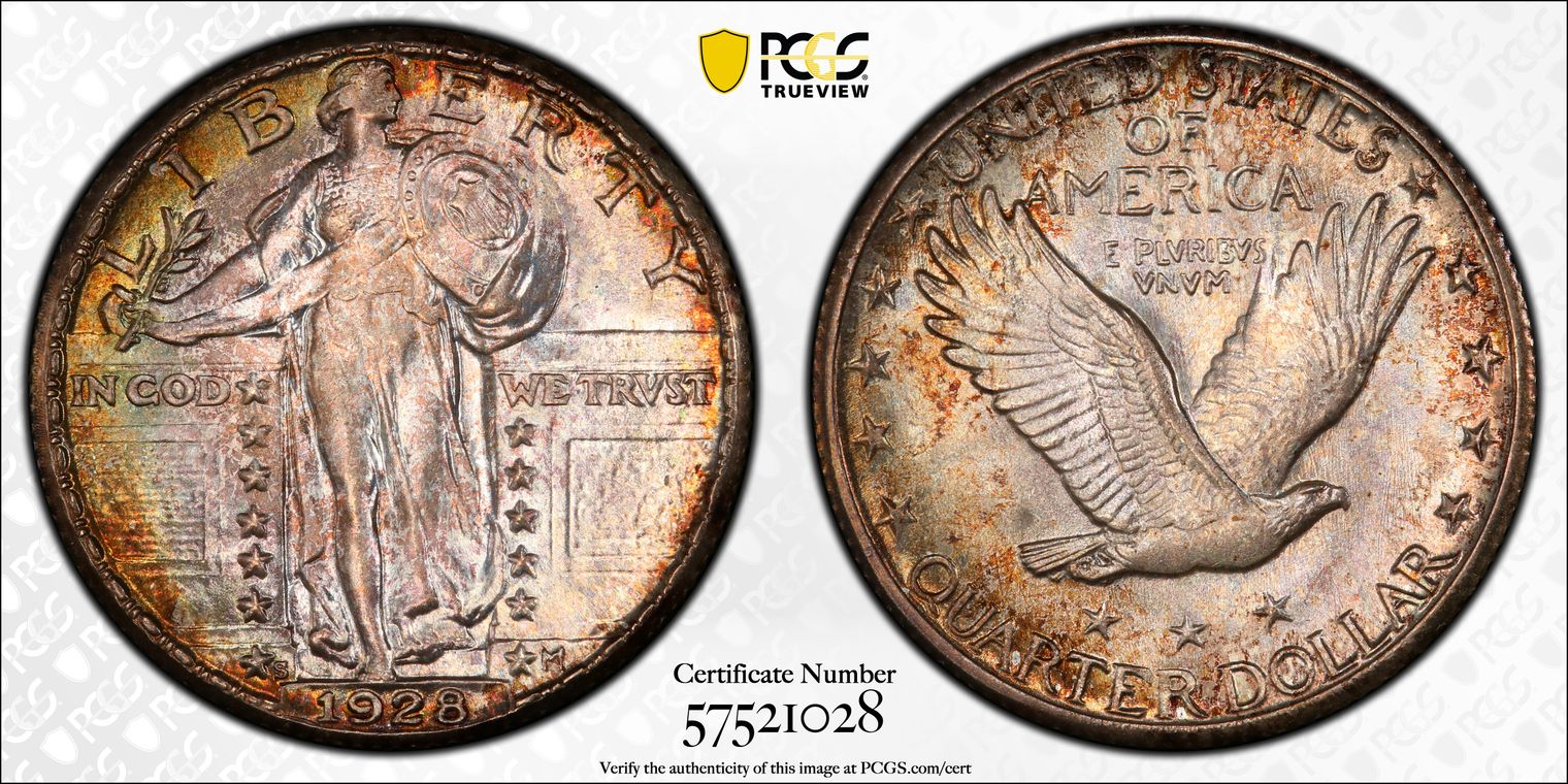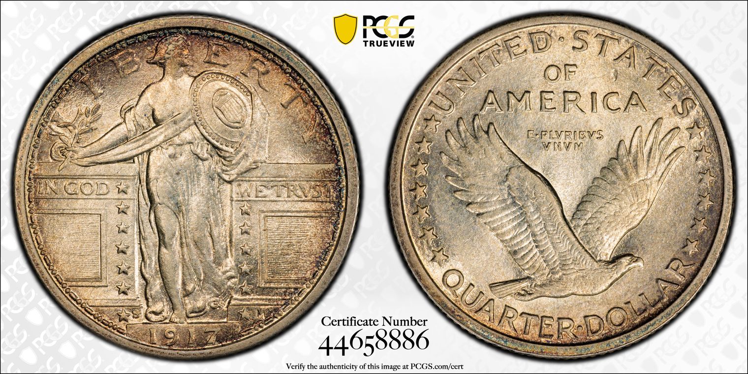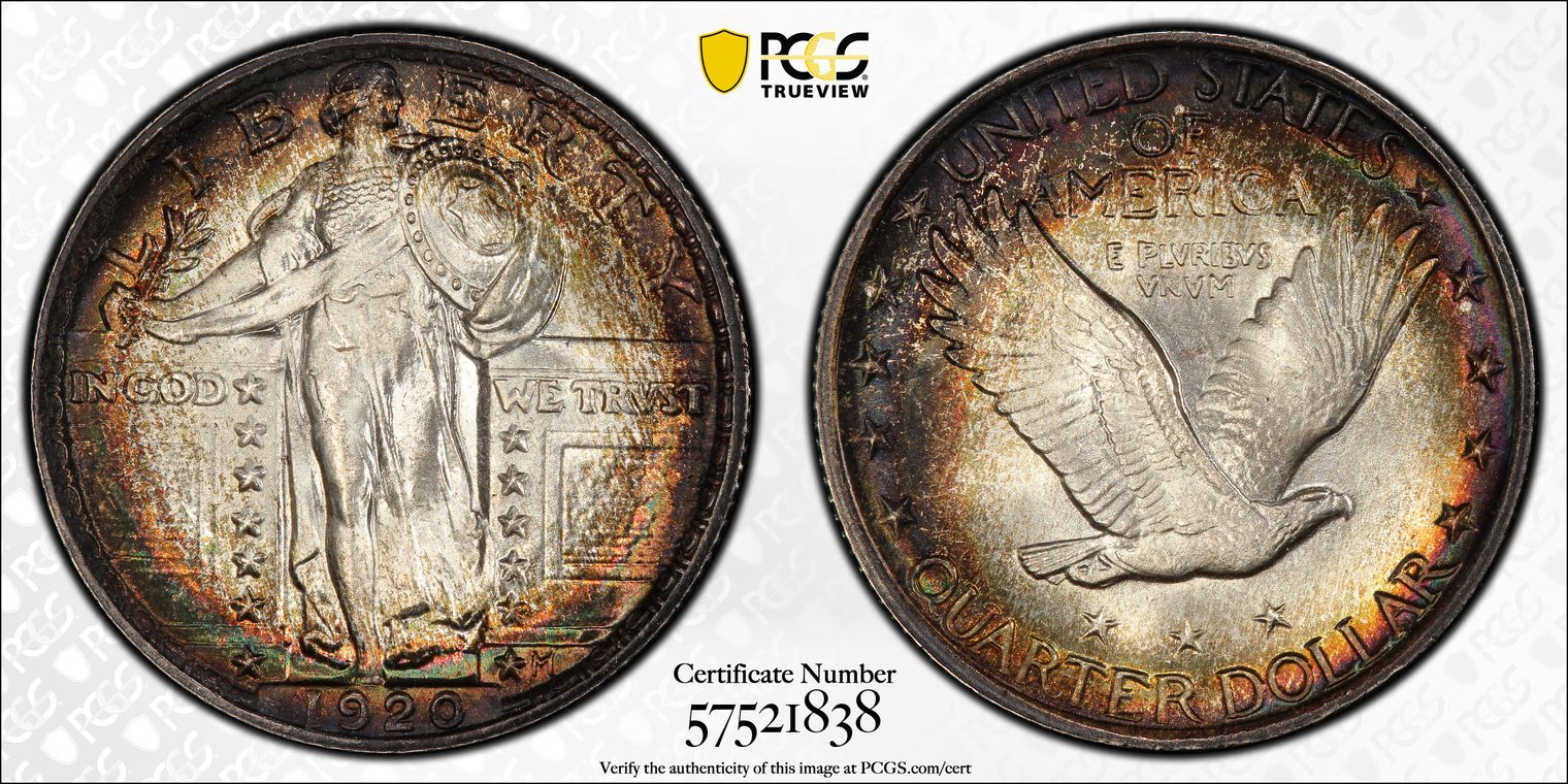CAC. Per the cataloger, "Ex: Simpson. The San Francisco issue is the scarcest 1917 Type One Standing Liberty quarter in high grade Full Head. This Superb Gem example is conditionally rare, and no higher-grade pieces are listed. It is beautifully preserved and sharply struck with rich satin luster. Vivid multicolor toning is every bit as spectacular as the grade, covering each side in concentric rings of color. A loupe fails to reveal distracting abrasions. Population: 21 in 67 (3 in 67+) Full Head, 0 finer. CAC: 4 in 67, 0 finer (8/20)."