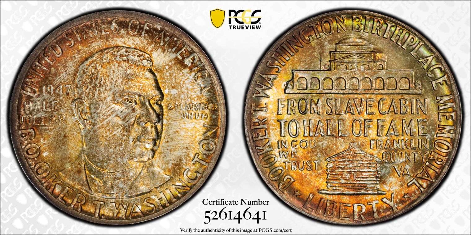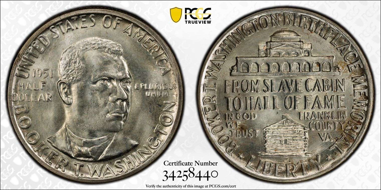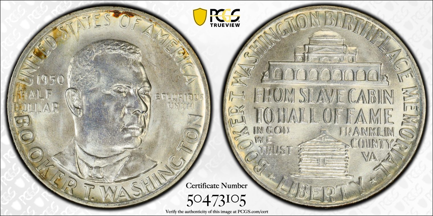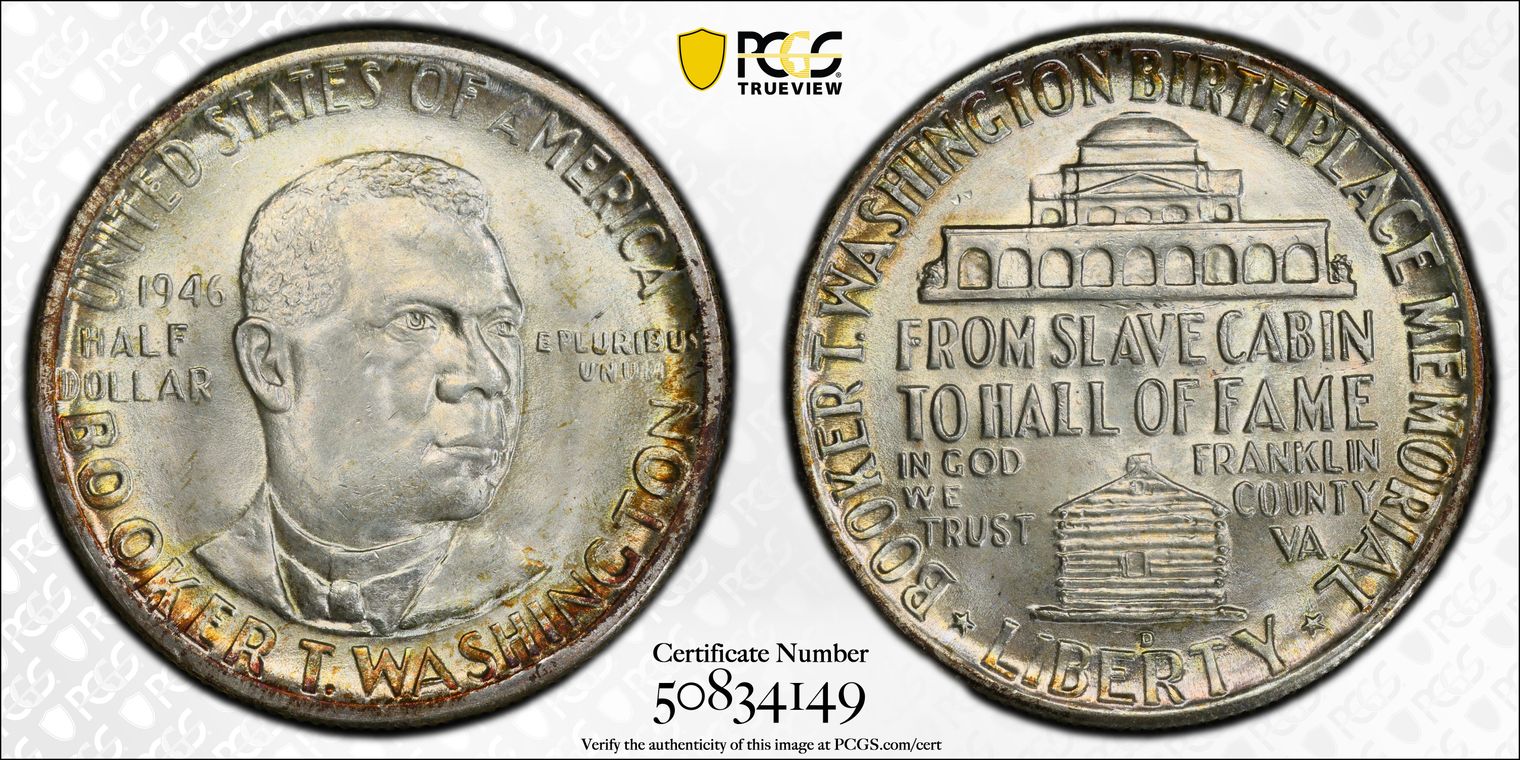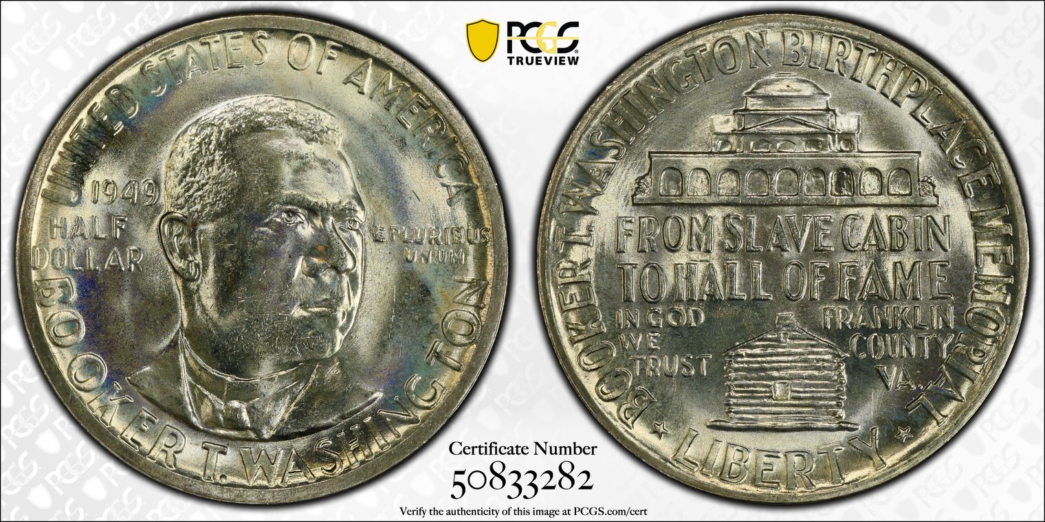 Per cataloger, "While one of the most common commemoratives in an absolute sense, the Booker T. Washington halves are VERY RARE so fine! Technically and aesthetically, this SUPERB GEM is all there! Impressive luster radiates through a layer of totally original and gorgeous envelope toning that delights the eye. Well struck and ultra clean, this 67+ is high end even for that lofty state! PCGS 137, NGC 95, CAC 87. There are 19 graded MS67+ at PCGS with just 8 finer. The most recent example we sold was in September 2019 for $2,115. The current PCGS Price Guide value is listed at $950, but a coin of this caliber should bring well in excess of that amount.er cataloger, " (10/8/20)