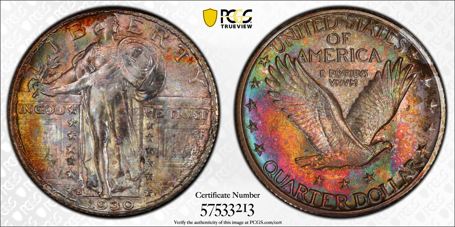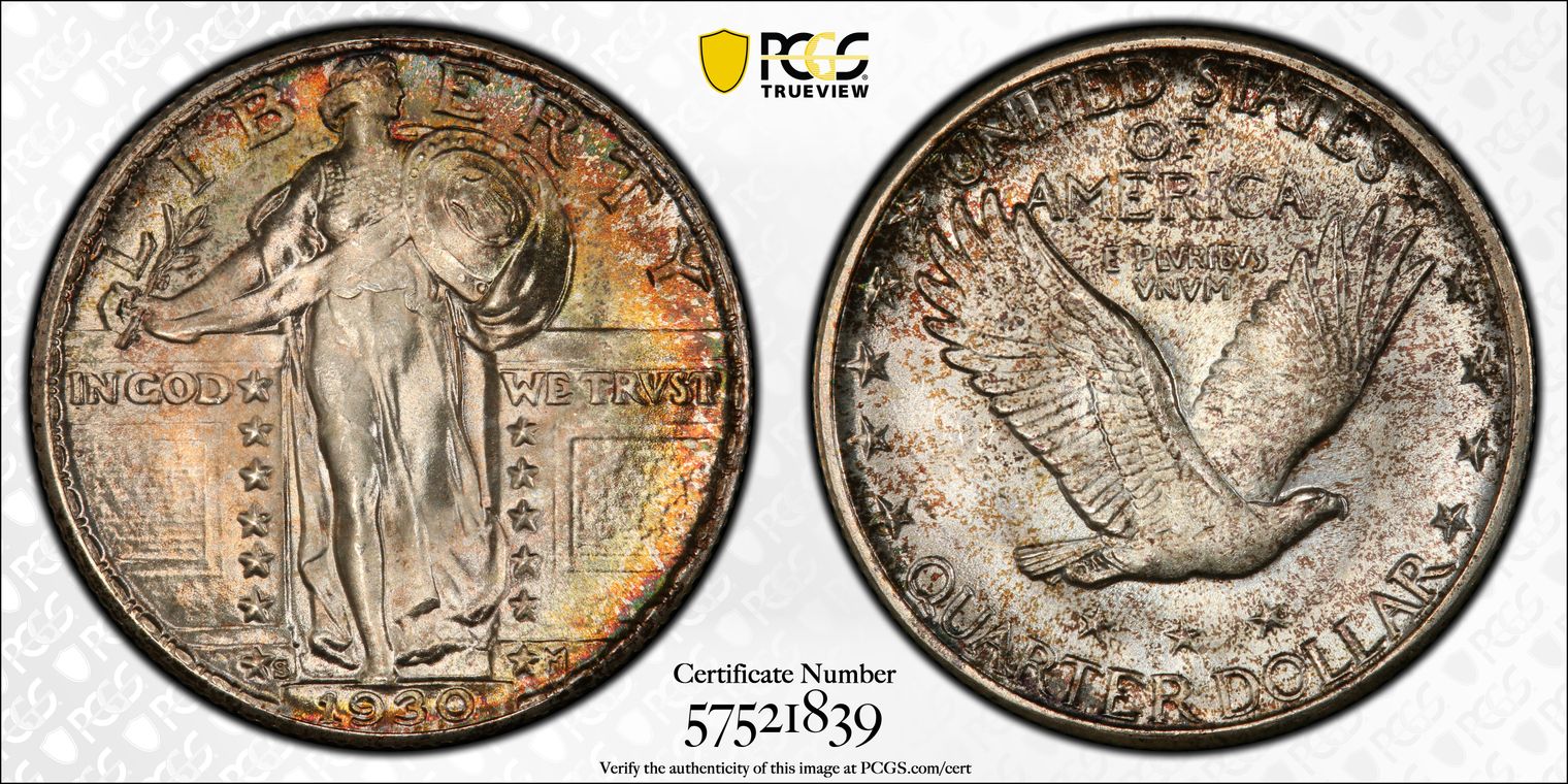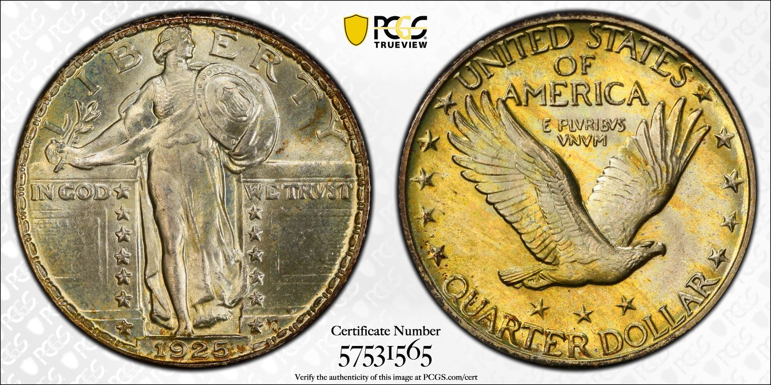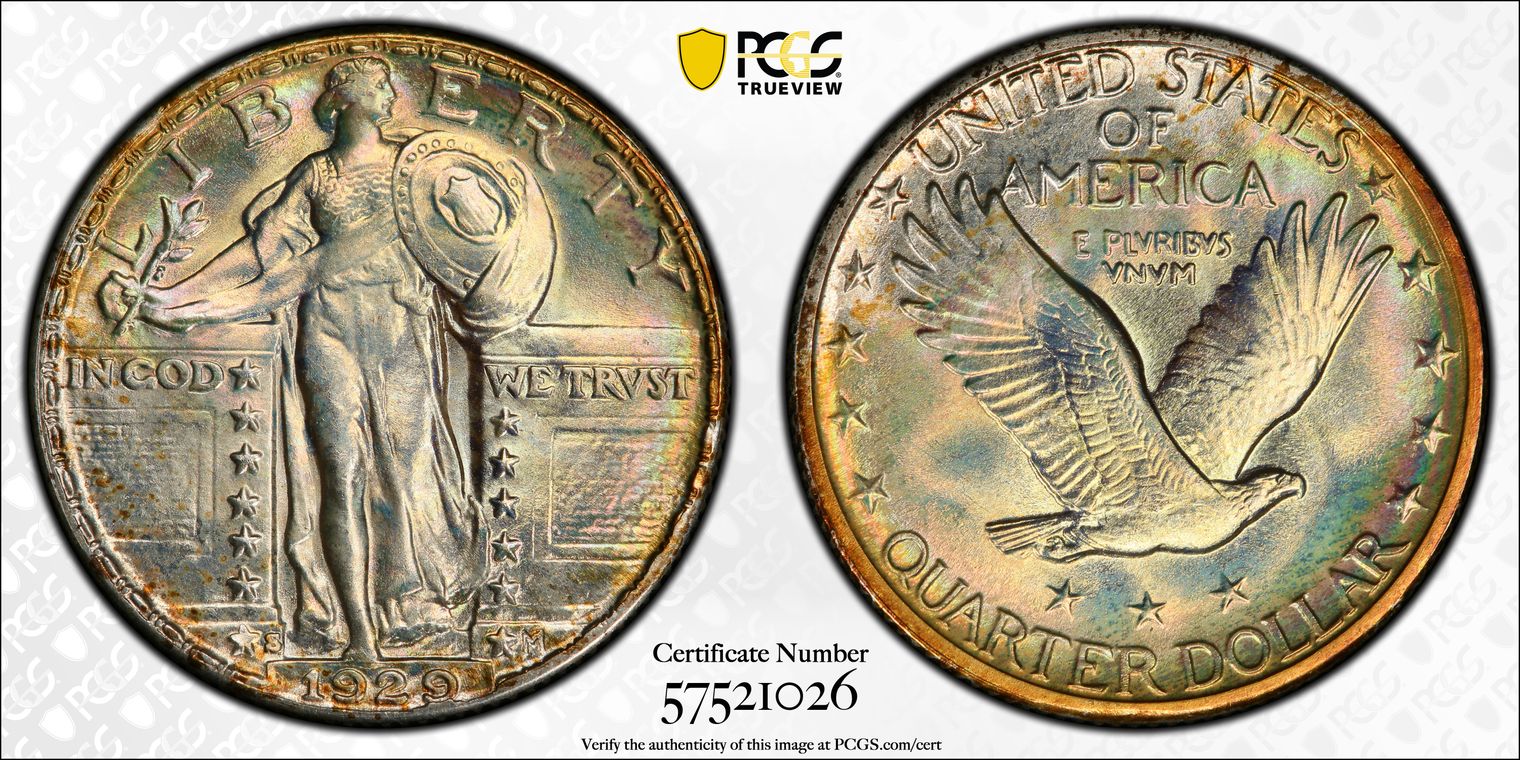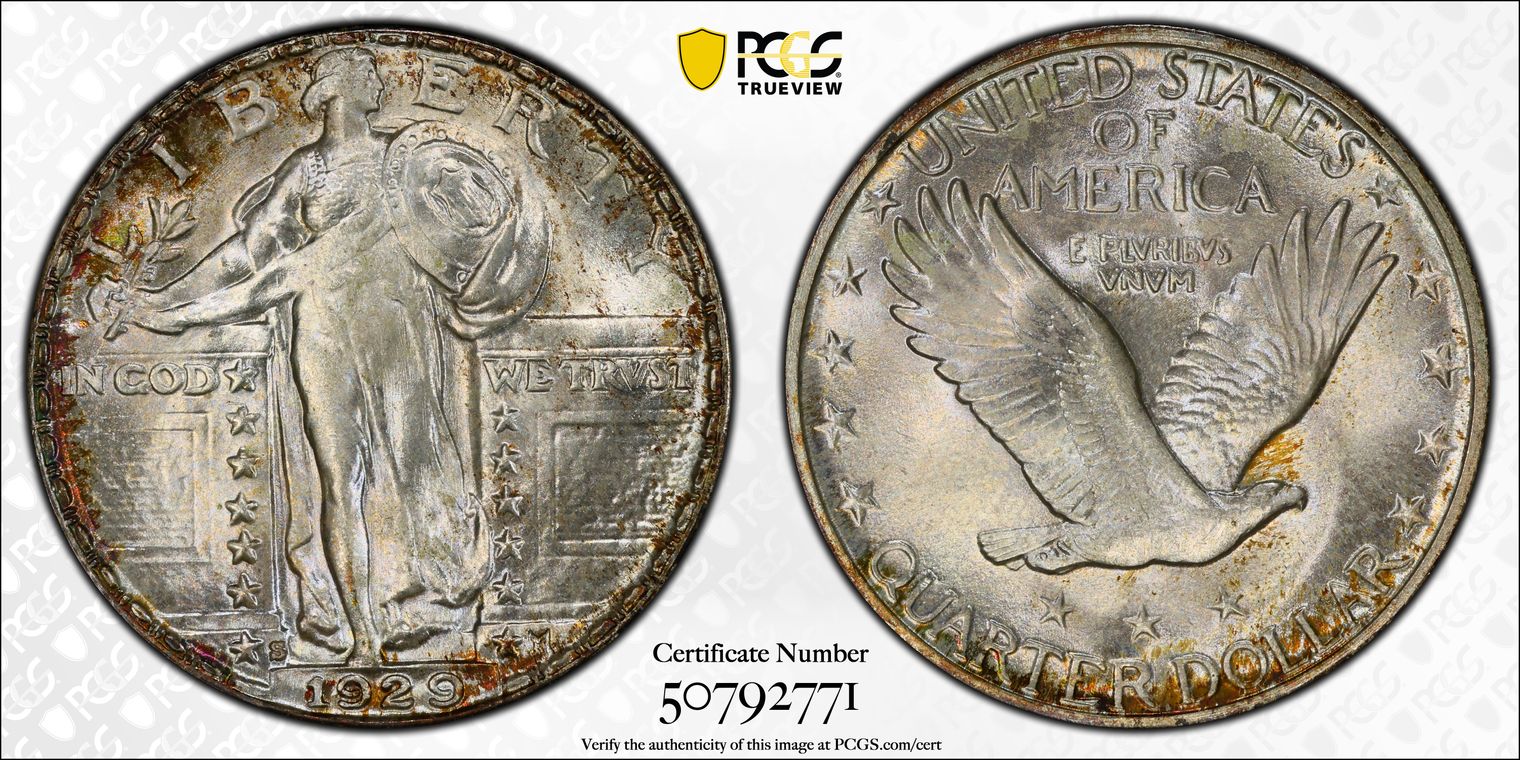 CAC. Per cataloger, "The significance of this specific coin requires an understanding of just how rare Standing Liberty quarters are in MS68. Most issues in the series are not known finer than MS67+. PCGS reports grading events for a grand total of only 16 coins in MS68 or MS68+ across the entire series, Full Head and non-Full Head coins included (12/19). None are finer at that service. Moreover, CAC has placed a sticker on only four MS68 coins, including three non-Full Head pieces and one Full Head coin. These figures are for the entire series. This coin is the sole finest 1929-S quarter at PCGS, outranking even the finest Full Head coins at that service. It is also the only 1929-S quarter in MS68 with CAC endorsement. The importance of this coin for Registry collectors is simply incredible. The coin displays satiny mint luster that appears flawless even under magnification. Delicate pastel toning casts each side in lovely rainbow hues, and Liberty's hairline is nearly complete. A finer 1929-S quarter simply does not exist, and there are only a few other Standing Liberty quarters of any date or mint that compare with this piece in terms of quality. Population: 1 in 68, 0 finer. CAC: 1 in 68, 0 finer (12/19)." Sold in GreatCollections Auction 9/22/19 as a PCGS/Gold CAC MS66 #7024585. Obtained from Heritage Auction 1/9/20 as a PCGS/CAC MS68 #38022735. Upgraded to a PCGS MS68+ and recertified by CAC.
