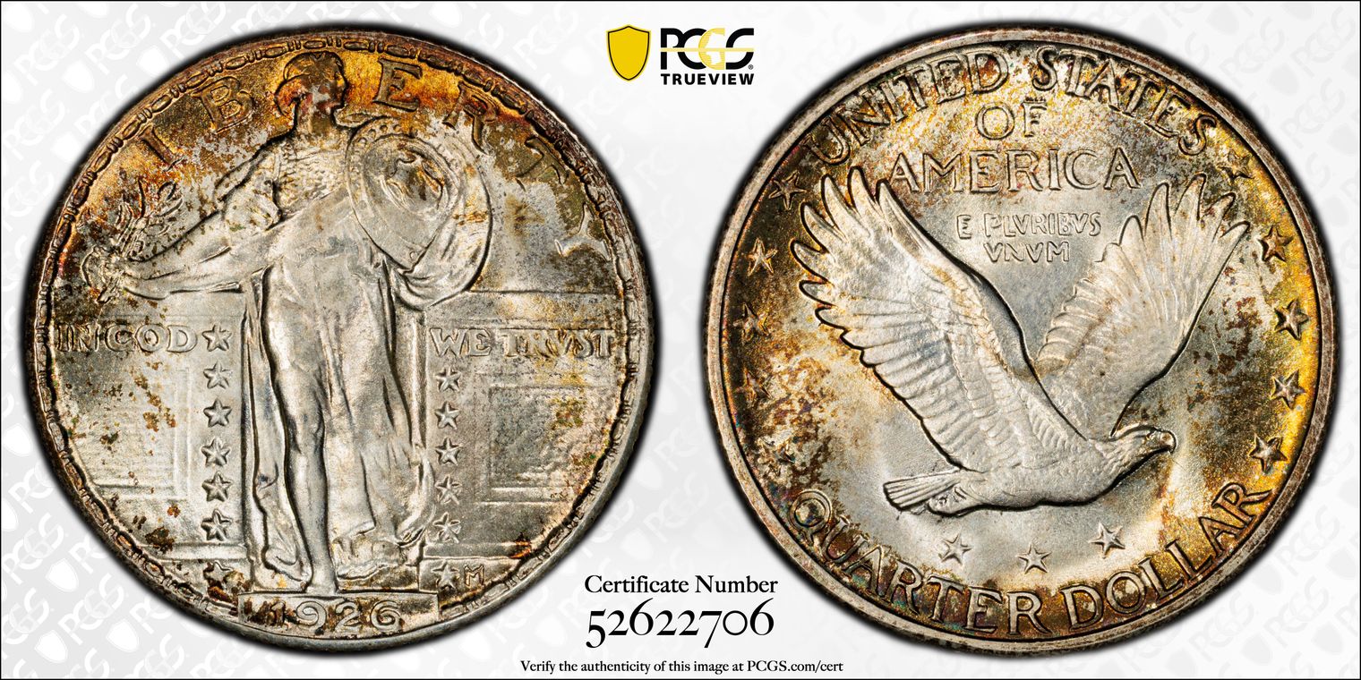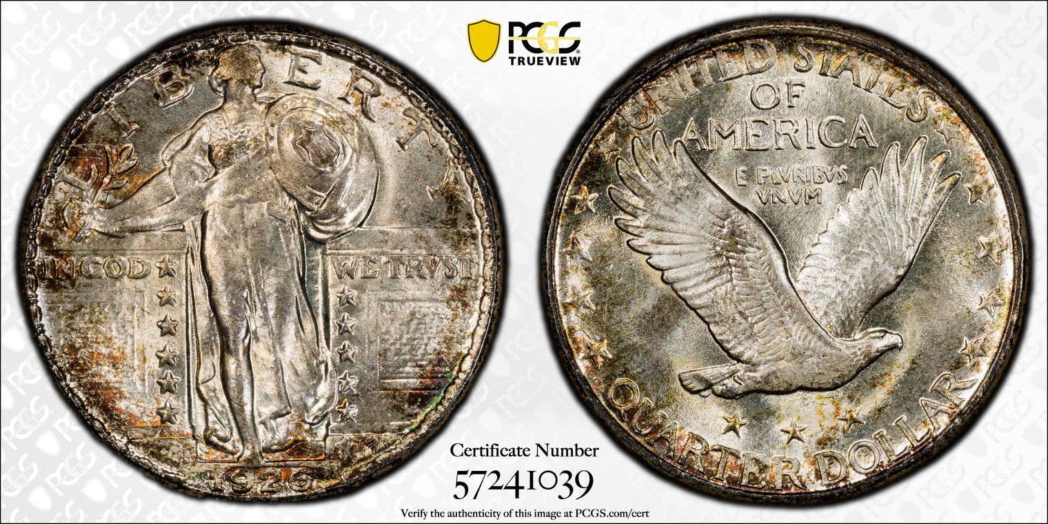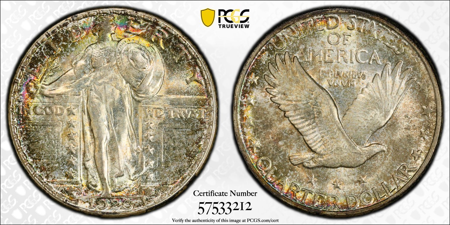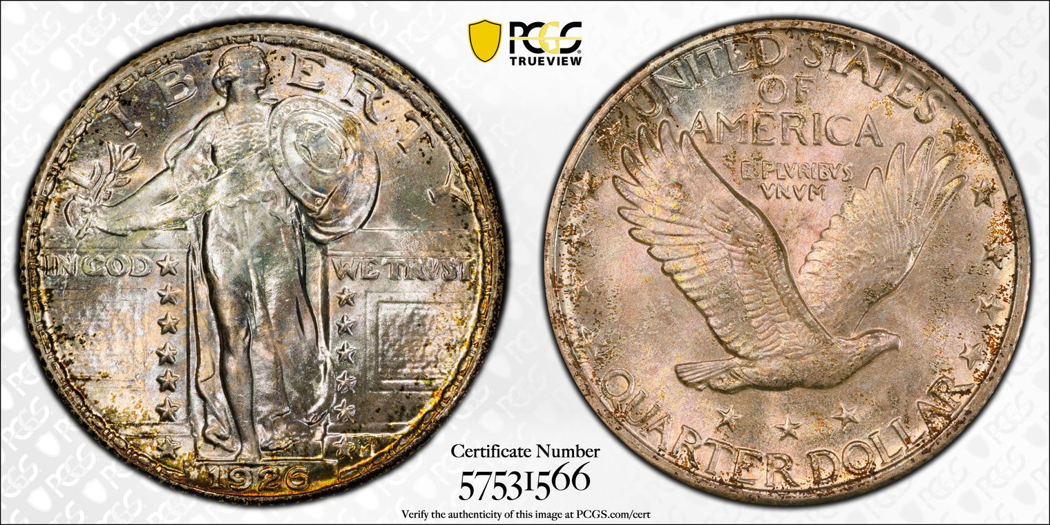 CAC. Per cataloger, "Without a doubt, this Superb Gem stands above almost every other known survivor of the conditionally elusive 1926 quarter. PCGS has seen only three non-Full Head coins in MS67 and none finer; the finest non-Full Head pieces at NGC are two coins each in MS67 and MS68 (2/16). This lovely piece exhibits satiny golden and sky-blue luster with small hints of olive, amber, and russet around the extreme outer peripheries. The strike is above-average for a non-Full Head coin, and the preservation is excellent." Obtained from Heritage Auction 3/4/2016, Lot number 4879.