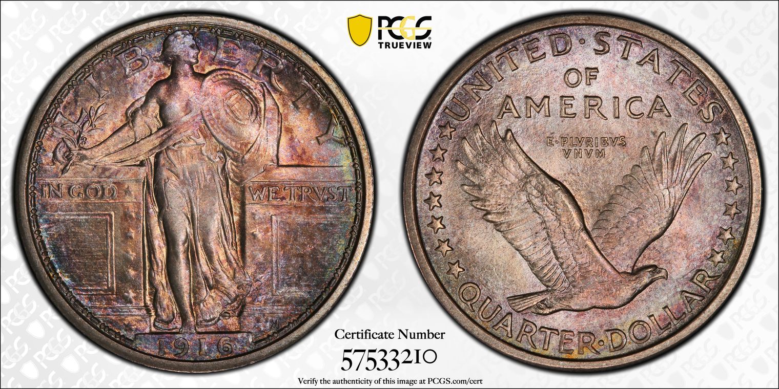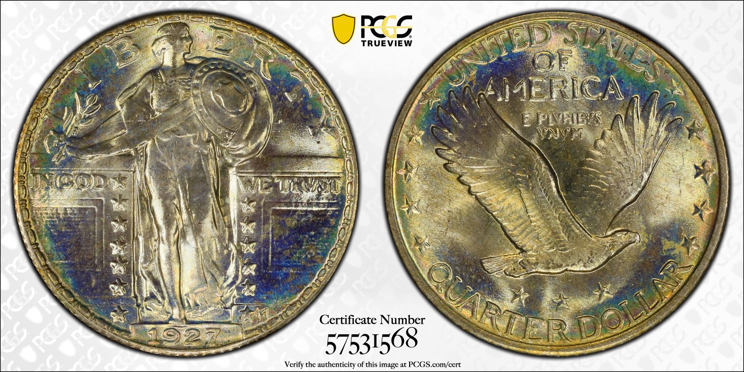 CAC. Ex. Simpson, Simper Fi. Per cataloger, "The San Francisco issue is the scarcest 1917 Type One Standing Liberty quarter in high grade Full Head. This Superb Gem example is conditionally rare, and no higher-grade pieces are listed. It is beautifully preserved and sharply struck with rich satin luster. Vivid multicolor toning is every bit as spectacular as the grade, covering each side in concentric rings of color. A loupe fails to reveal distracting abrasions. Population: 21 in 67 (3 in 67+) Full Head, 0 finer. CAC: 4 in 67, 0 finer (8/20)." Obtained from GreatCollections Auction of the Simper Fi Collection on July 31, 2022, Lot 1166909.