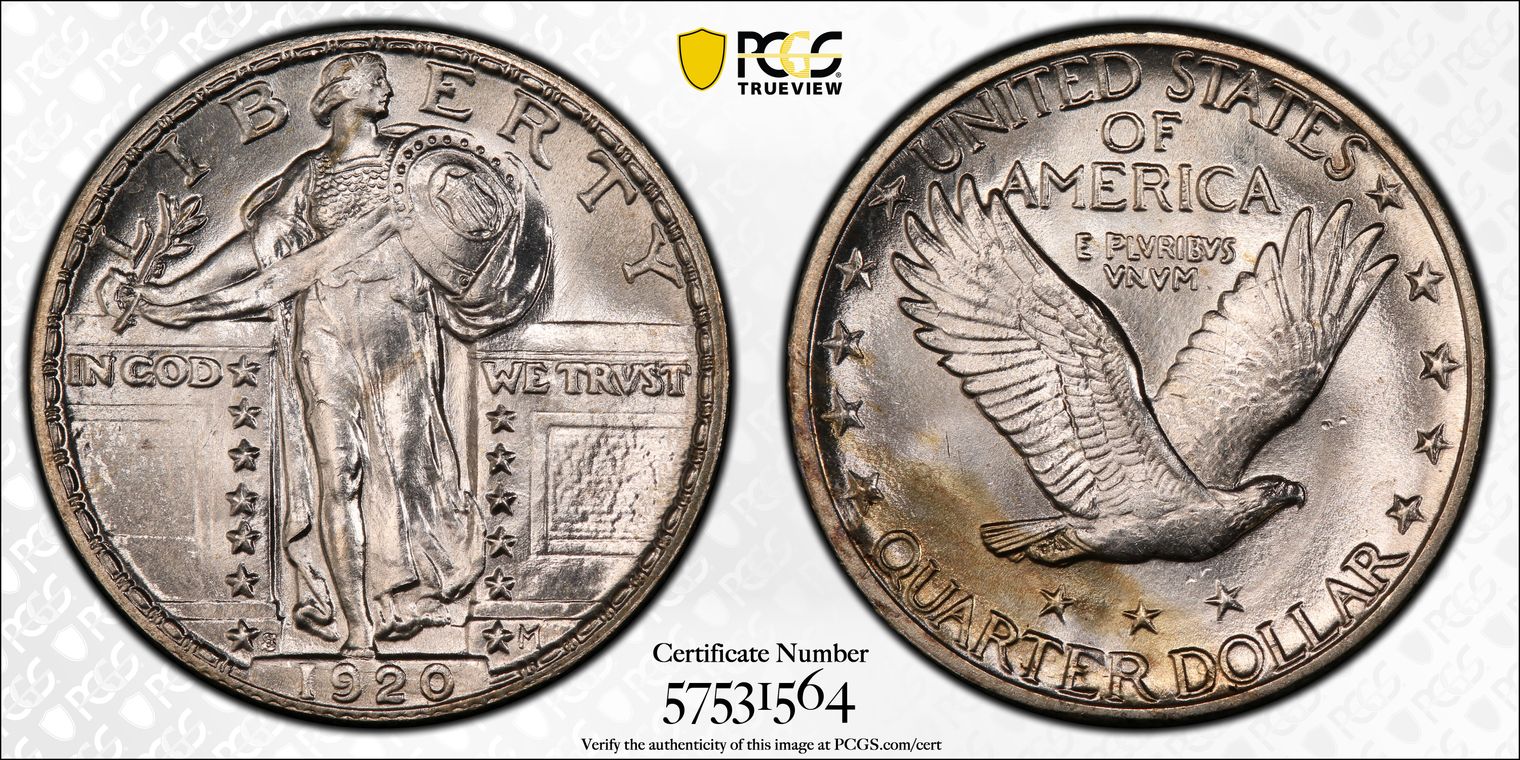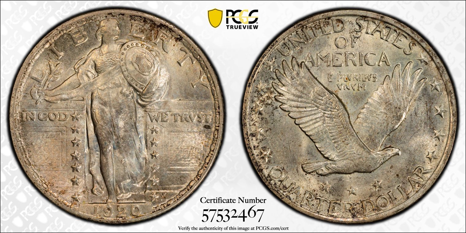 CAC. Per cataloger, "Ex: J.H. Cline. Almost belying its mintage of more than 3.5 million pieces, the 1920-D Standing Liberty quarter is a better date in all grades and becomes a distinct rarity in Superb Gem condition where it is without a doubt underrated. PCGS and NGC list a combined five MS67 non-Full Head coins (three and two pieces, respectively) and none finer (11/15). The rate of auction appearances in this grade is comparably low. In more than two decades, we have offered an MS67 non-Full Head example on only four occasions, two of which were earlier appearances of this same coin. The last example garnered $10,575 in the Long Beach Signature sale (Heritage, 6/2015), lot 3931. Full Head Superb Gems appear at auction even less frequently. This piece represents a rare and important opportunity for the Standing Liberty quarter connoisseur. It is one of the most visually impressive examples the cataloger has examined, showing surfaces rich in frosty silver-gray luster with scattered freckles of russet color toward the peripheries. There is not a single bothersome bag mark, and the only area of mentionable strike weakness occurs on Liberty's head, which is about 50% complete. Ex: Long Beach Signature (Heritage, 9/2002), lot 6649; Long Beach Signature (Heritage, 2/2003), lot 6757. From The Jay Cline Collection of Standing Liberty Quarters." Obtained from Heritage Auction 1/7/2016, Lot number 5011 graded PCGS MS67 #467757. Upgraded to PCGS MS67+. Pop 1/1 (12/23).