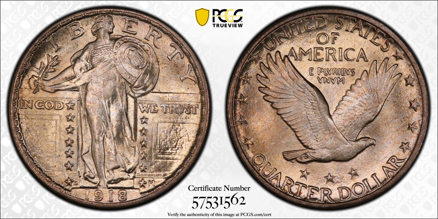 CAC. Per cataloger, "the 1918-D Standing Liberty quarter is conditionally rare in Premium Gem condition and a major rarity in MS67. There are only six Superb Gems certified, all at PCGS, including four non-Full Head MS67s and two MS67 Full Head pieces (5/18). Only two of the non-Full Head coins are CAC approved, one being offered here. This magnificent coin yields vibrant, glistening mint luster that is untoned across the interiors. Tinges of russet color appear around the borders. Liberty's temple and the shield rivets are a trifle soft, but no other imperfections are mentionable." Obtained from Heritage Auction 6/14/18, Lot number 3925 graded PCGS/CAC MS67 #30849921; upgraded to PCGS/CAC MS67+ Pop 1/0 (12/23).