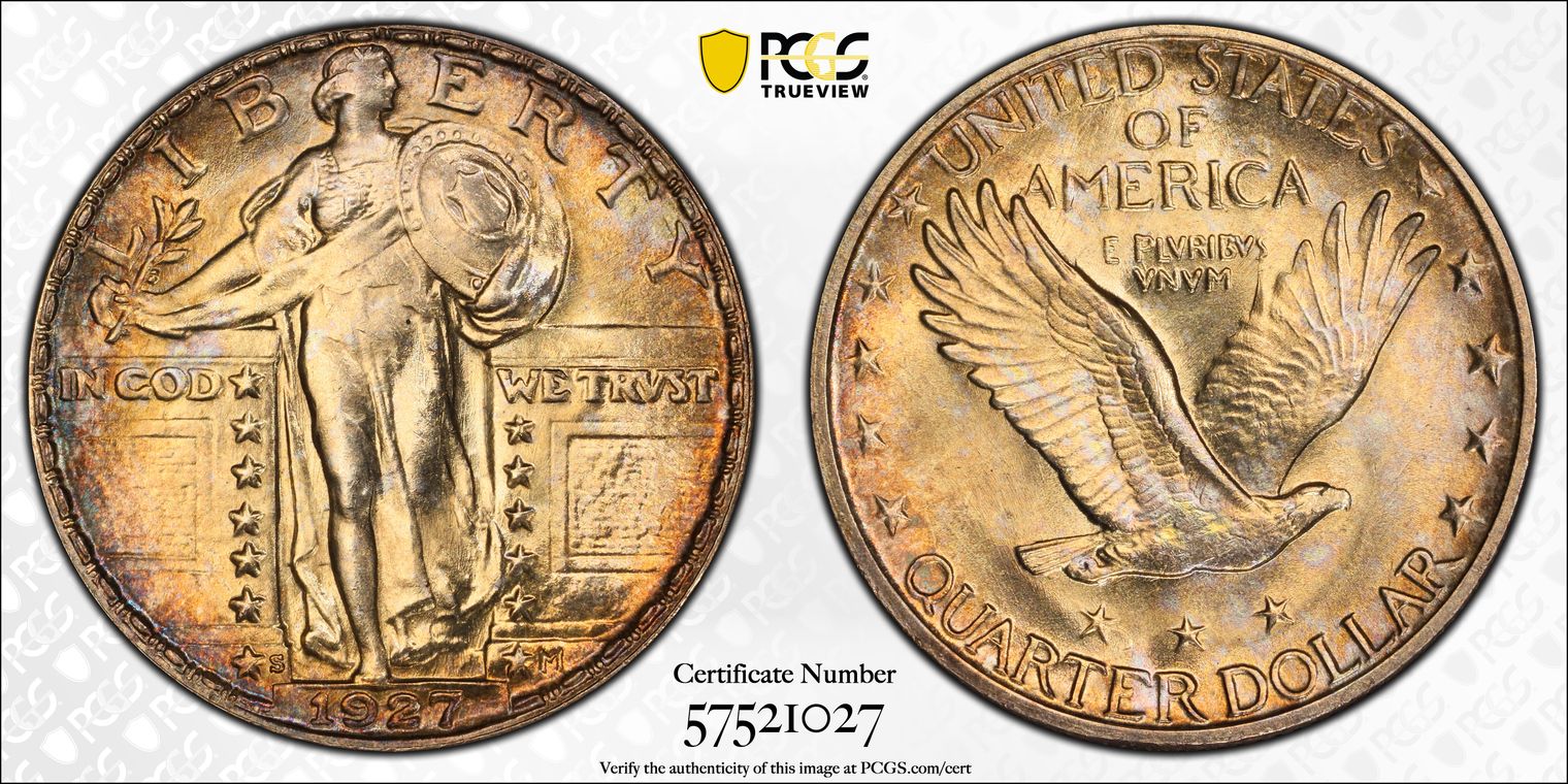 CAC. Per cataloger, "One of the 10 finest-certified examples at both services combined (3/17), this Superb Gem 1927-S quarter is well-preserved and visually spectacular, particularly in comparison to the often dull and lifeless merits of lower-end Mint State pieces. The pristine, mark-free surfaces offer booming luster and a soft cartwheel effect. Each side is delicately toned in champagne hues with original shades of golden-brown that mix with splashes of iridescence at the rims. Although the strike does not merit the Full Head designation, it is slightly above average overall, with only localized areas of weakness that are common to this issue -- on the shield rivets, head and central gown lines. This is a remarkable quarter that will certainly become a favorite of its new owner, and a piece that can be admired by all collectors for its remarkable technical quality and aesthetic beauty. . Population: 6 in 67 (1 in 67+), 0 finer (3/17)." Sold by Heritage on 1/3/2007 as an NGC #1805761-001 MS67, Lot number 943. Obtained from Heritage Auction as a PCGS #25656266 MS67 Pop 6/2 (4/17) 4/27/2017, Lot number 4037. Upgraded to PCGS/CAC MS67+ Pop 2/0 (12/23).