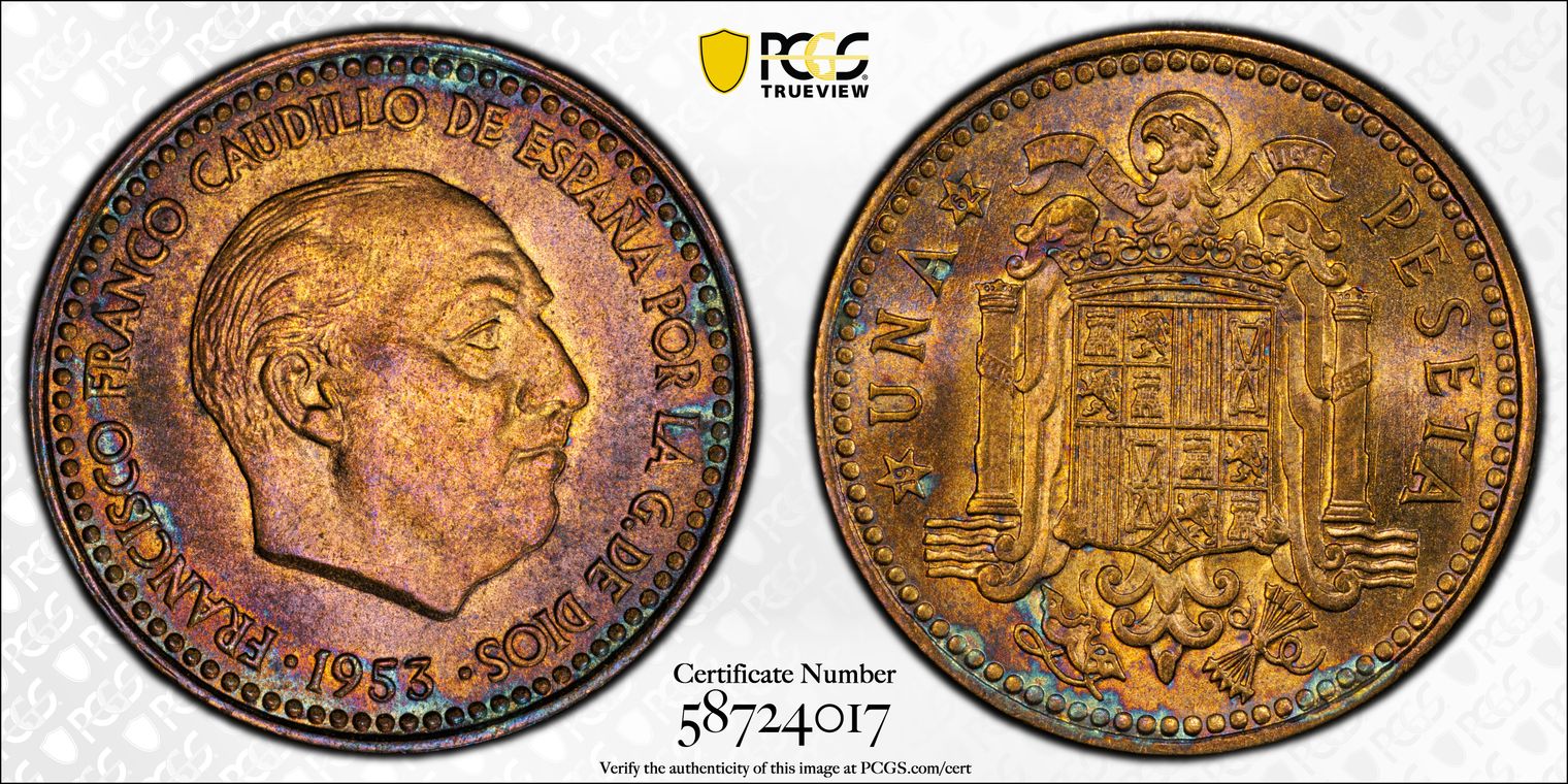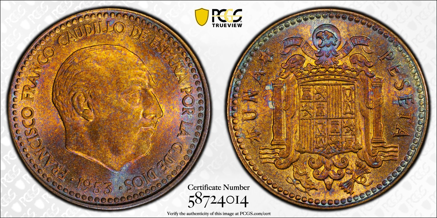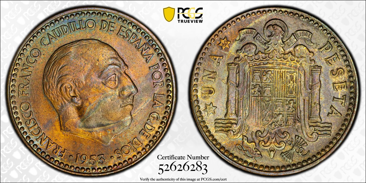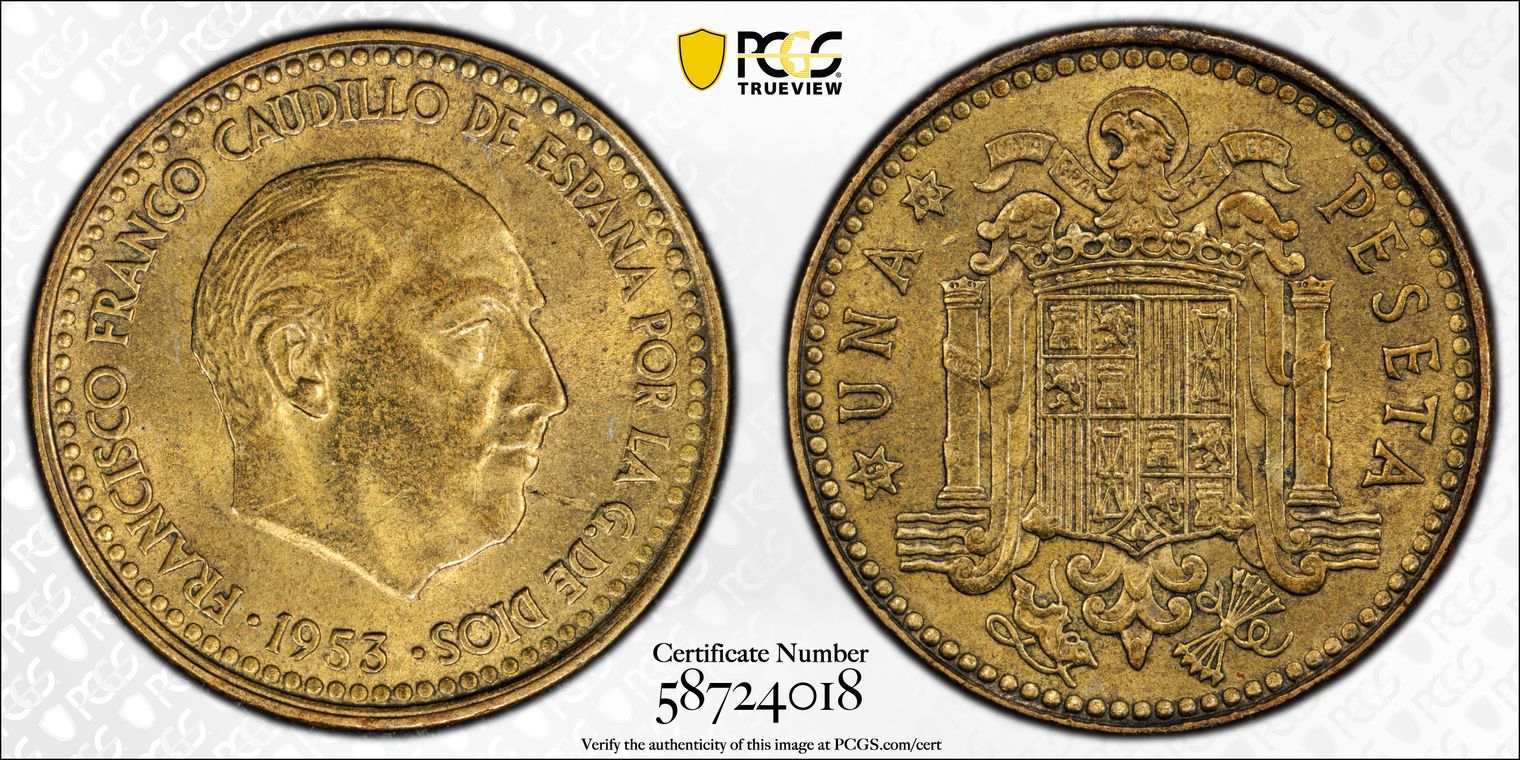 Bought these errors decades ago when other dealers in Madrid told me I was crazy for wasting my time on them! Having been stationed in Spain when these were minted and subsequent years, I have some insight on their history…. Most offered to me over the years were not gems with a large number having been cleaned and or weakly struck as many were…. Out of an estimated mintage of 30,000 pieces, many pieces were mishandled, and cleaned leaving a minuscule amount which may or may not grade choice or gem uncirculated. I would wager very few gems exist?? PCGS needs to look at their weighting system for this variety as it is NOT A common coin and should be weighted about an 8, not the 1 it is weighted at! I would surmise this variety is approximately 200 to 300 times the value of all the coins of this set combined!?