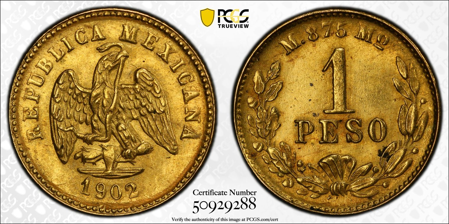 1902-Mo M Peso KM-410.5 Small Date Au MS62