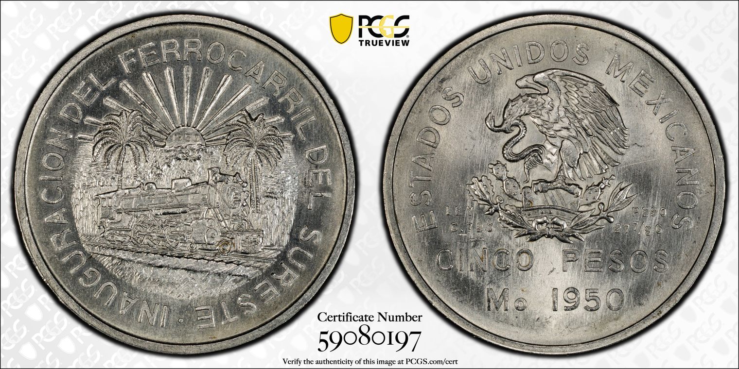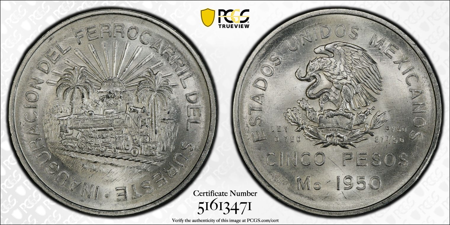 1950-Mo 5 Peso Southeastern Railroad KM-466 Ag MS66