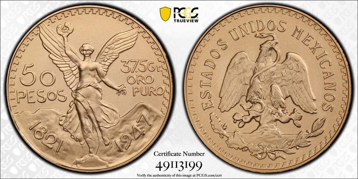 1947 50 Peso New Die Restrike KM-481 Au MS70