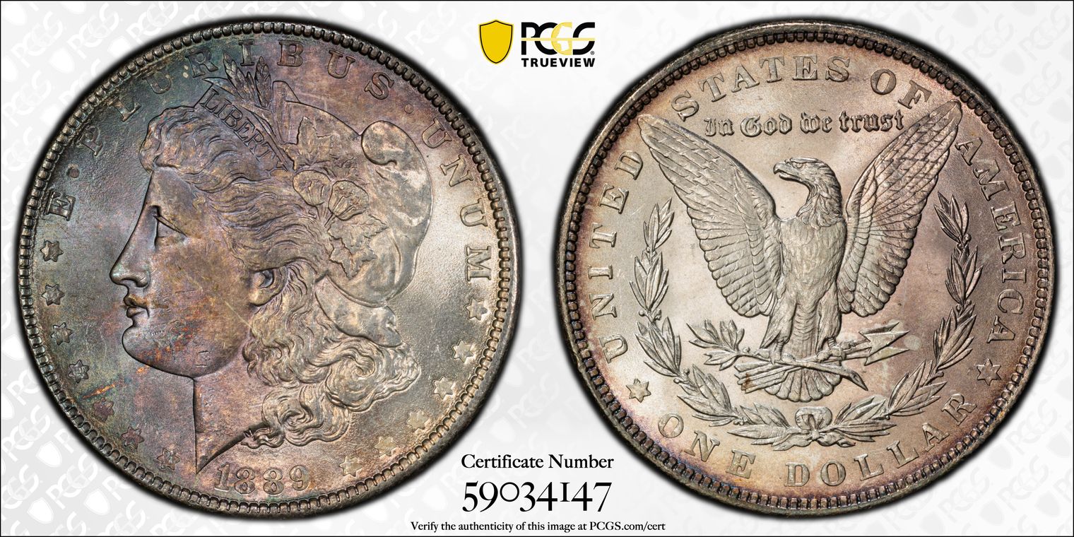CACG Certification 7492.65/869330618 | Silver Witter Brick | Strike: Strongly executed with excellent detail throughout, Liberty's hair curls and cap exhibit sharp separation, stars are fully defined and pointed, and the eagle's breast feathers, wing tips, and talons display crisp, above-average separation for the issue. A well-struck example that avoids the occasional softness seen on 1884-Ps | Surface: Superbly clean and premium for the grade; fields are smooth and distraction-free with only the faintest, scattered micro-ticks that require close inspection to detect; no bag marks, hairlines, or spots disrupt the eye appeal | Luster: Blazing satiny-frosty cartwheel brilliance radiates across both sides, the classic mint frost skin of high-end 1884-P Morgans gives it a fresh-from-the-bag glow, with strong, rolling luster that dances under light for outstanding visual pop | Toning: Subtle yet attractive light golden-silver patina blankets the surfaces evenly, with soft warm honey and faint champagne accents hugging the peripheries on both obverse and reverse. This natural, restrained album toning adds warmth and originality without masking the brilliant underlying luster—elegant enhancement rather than heavy color.